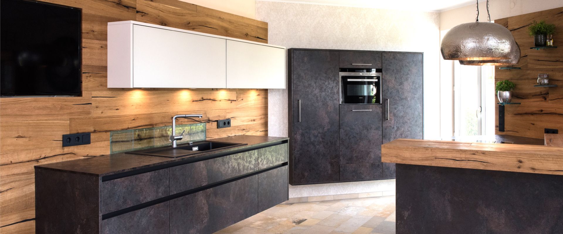 Schwarz schimmernde Fronten mit Eisenanteilen und edles dunkles Holz mit starker Maserung sind schon für sich genommen ziemlich schick. Zusammen wie in unserer Collections-Küche? Absolut umwerfend! Besonders schön ist hier die freistehende Kücheninsel mit Tresenlösung und passender Sitzbank.