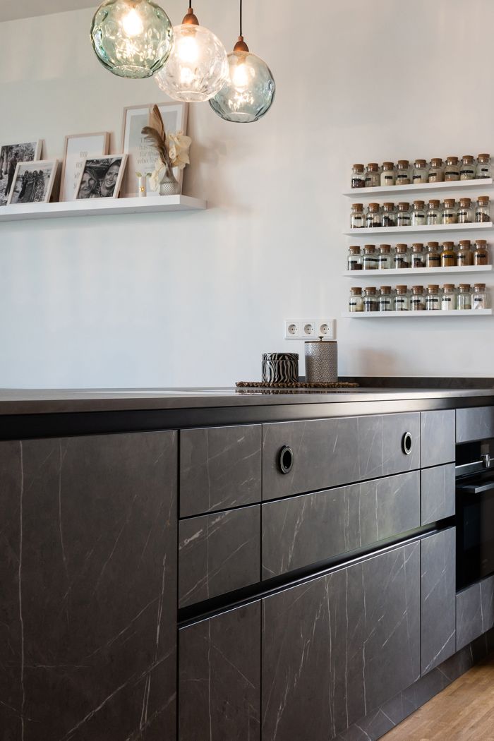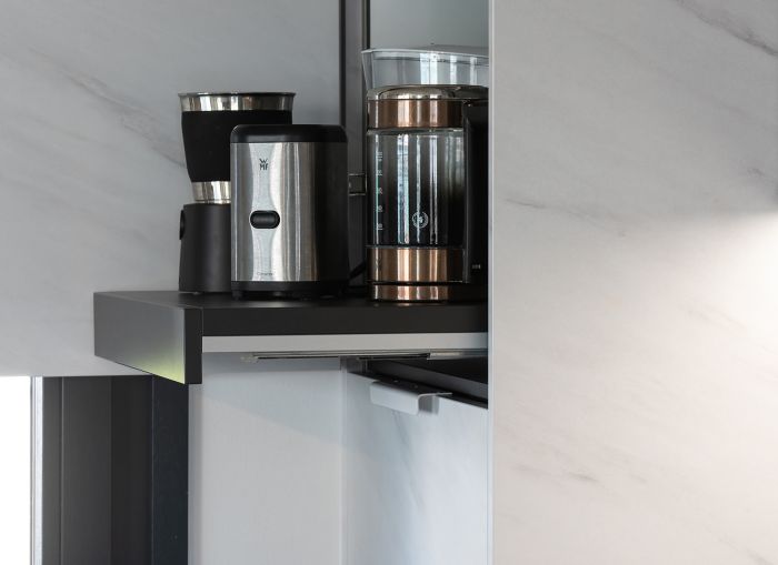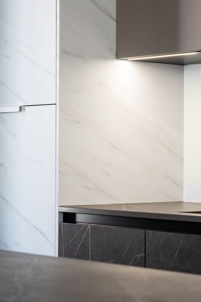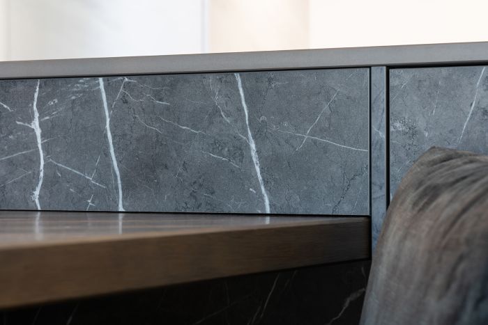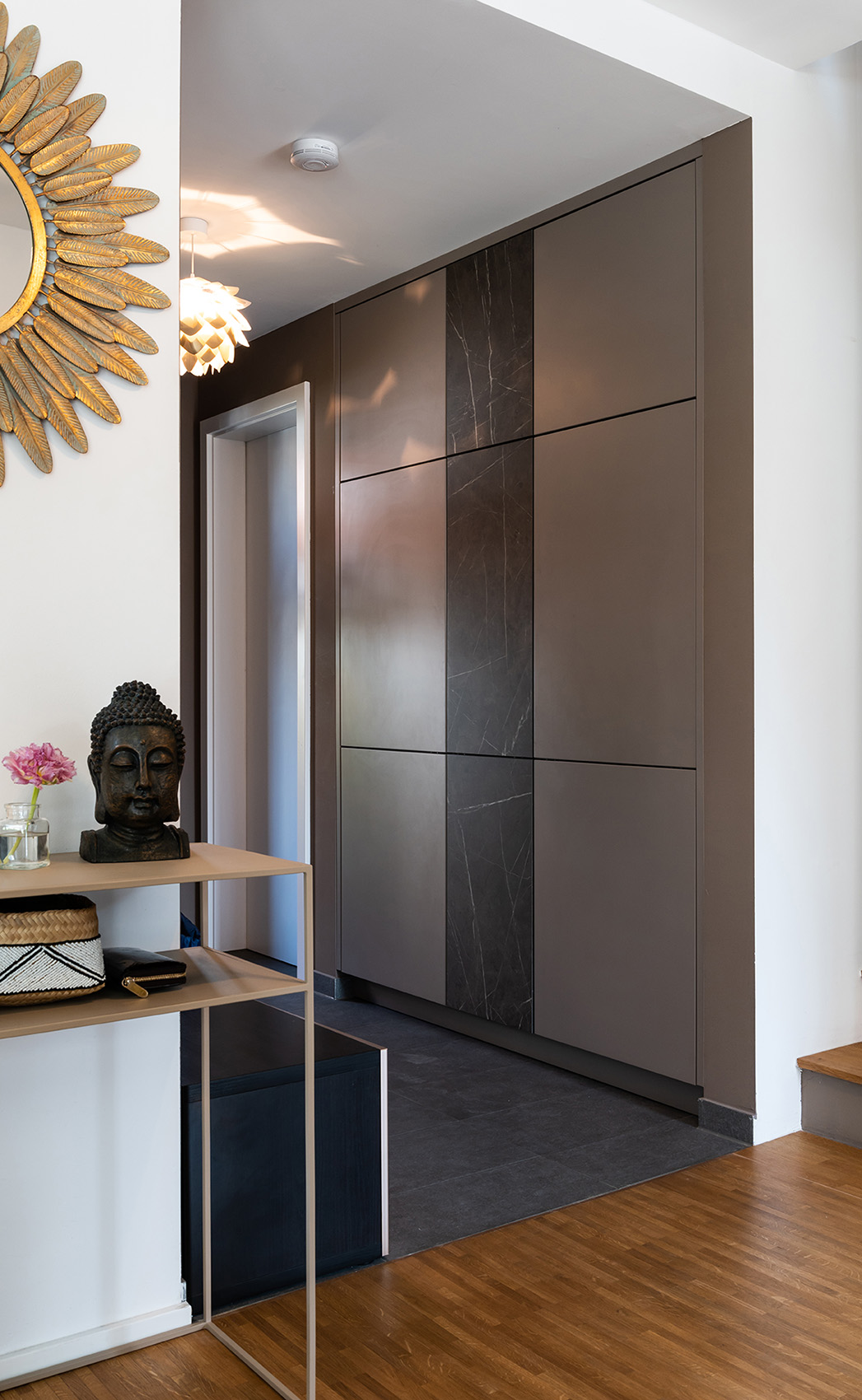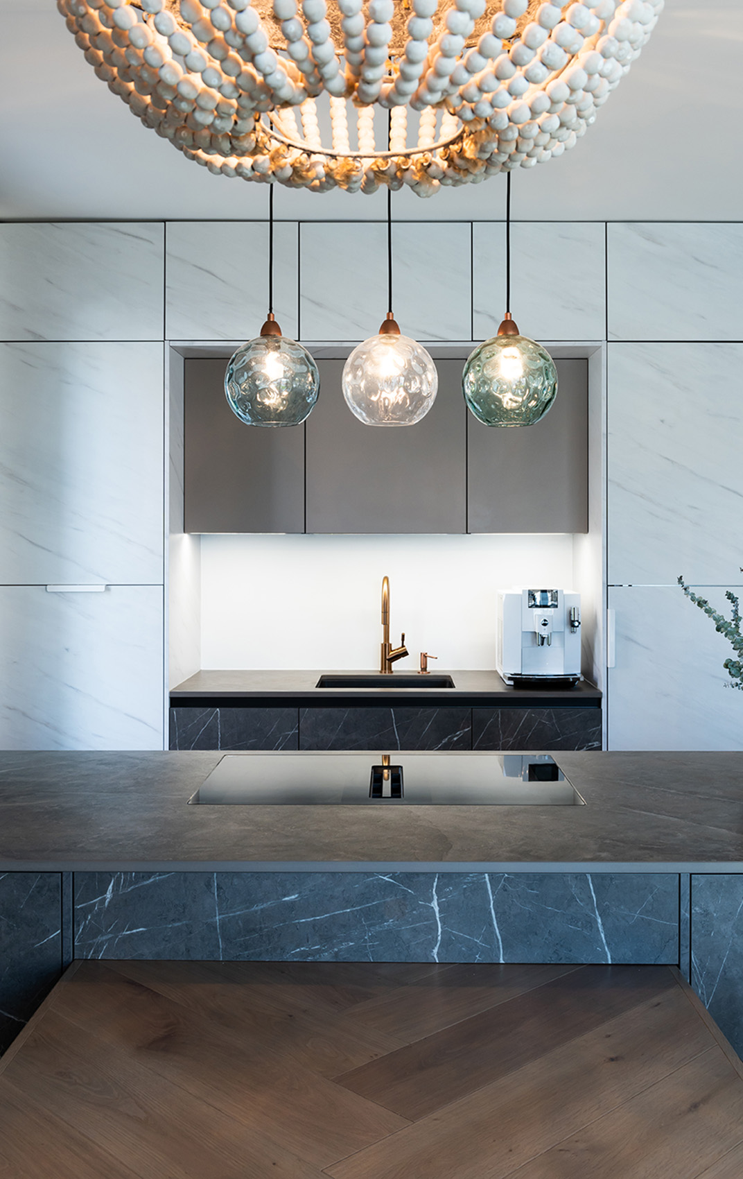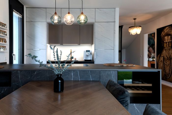 Entsprechend der Kundenwünsche zieren die hochwertigen Fronten mit Anti-Print-Eigenschaften Küche, Diele und Wohnzimmer. Der Übergang vom Koch- zum Essbereich wird durch die elegante Kücheninsel mit umfassenden Stauraumoptionen markiert.