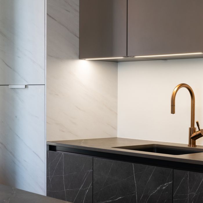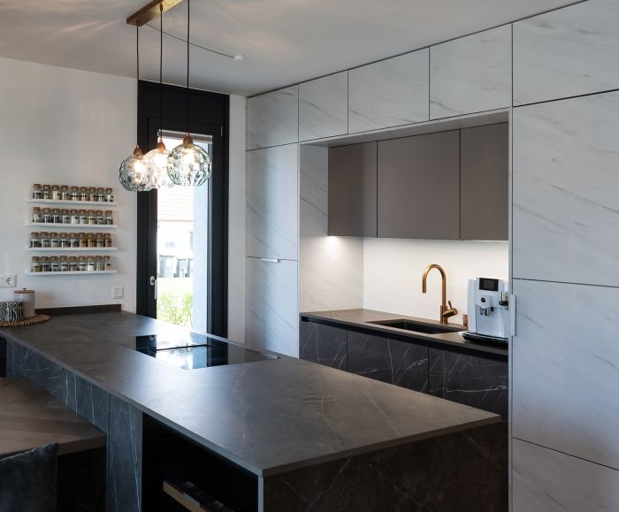 Modern, zeitlos und edel in einem. Goldene Armaturen und matte UV-Lackfronten in Marmoroptik verleihen dieser offenen Wohnküche einen eleganten Touch.