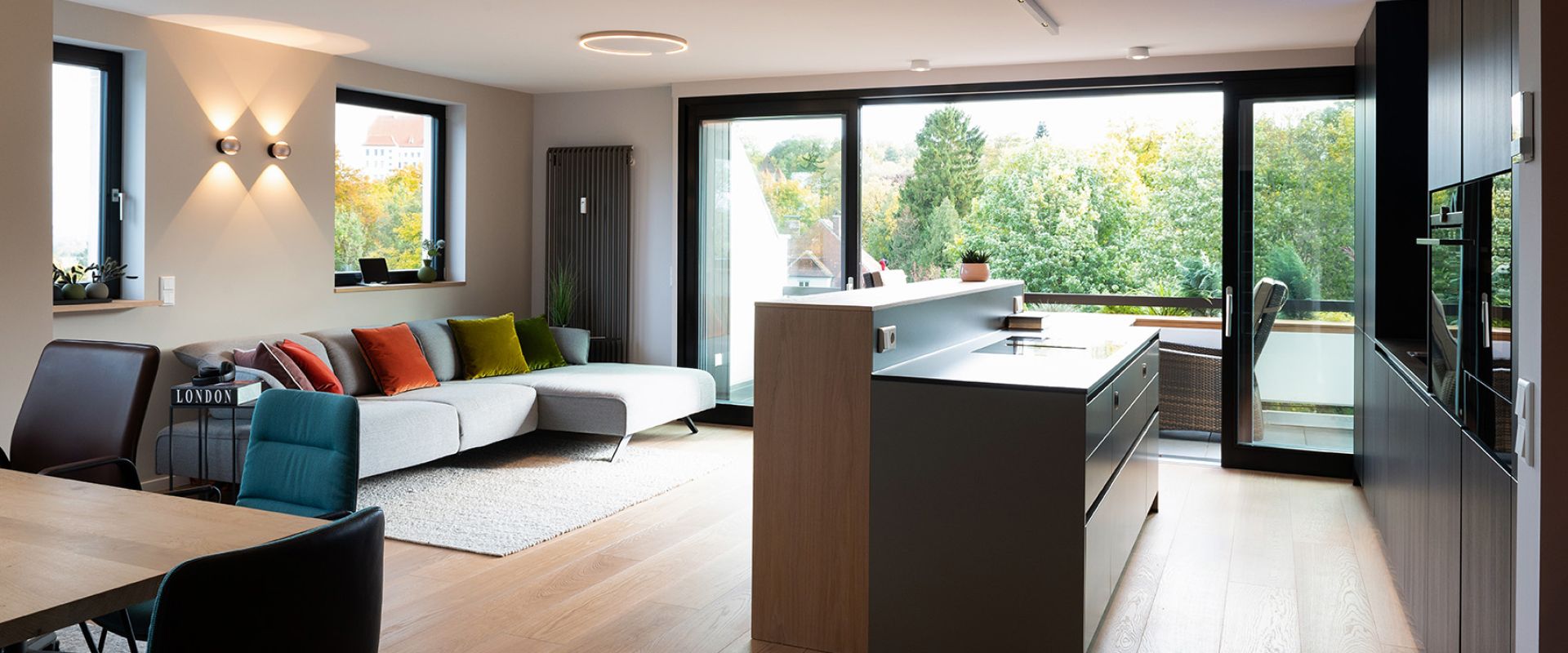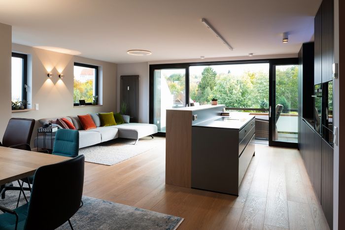 Aus zwei wird eins. Der offene Wohn- und Essbereich schließt sich nahtlos an diese schöne Küche mit dem gewissen Extra an.