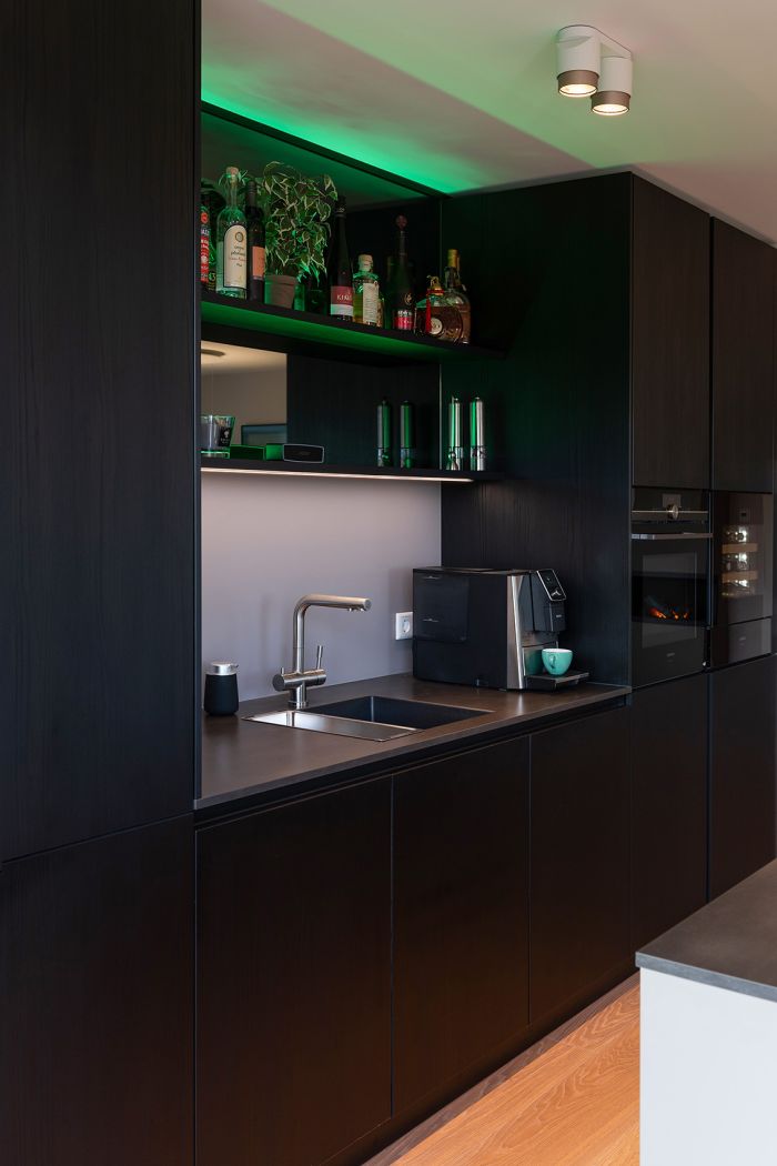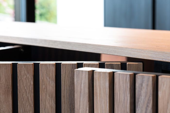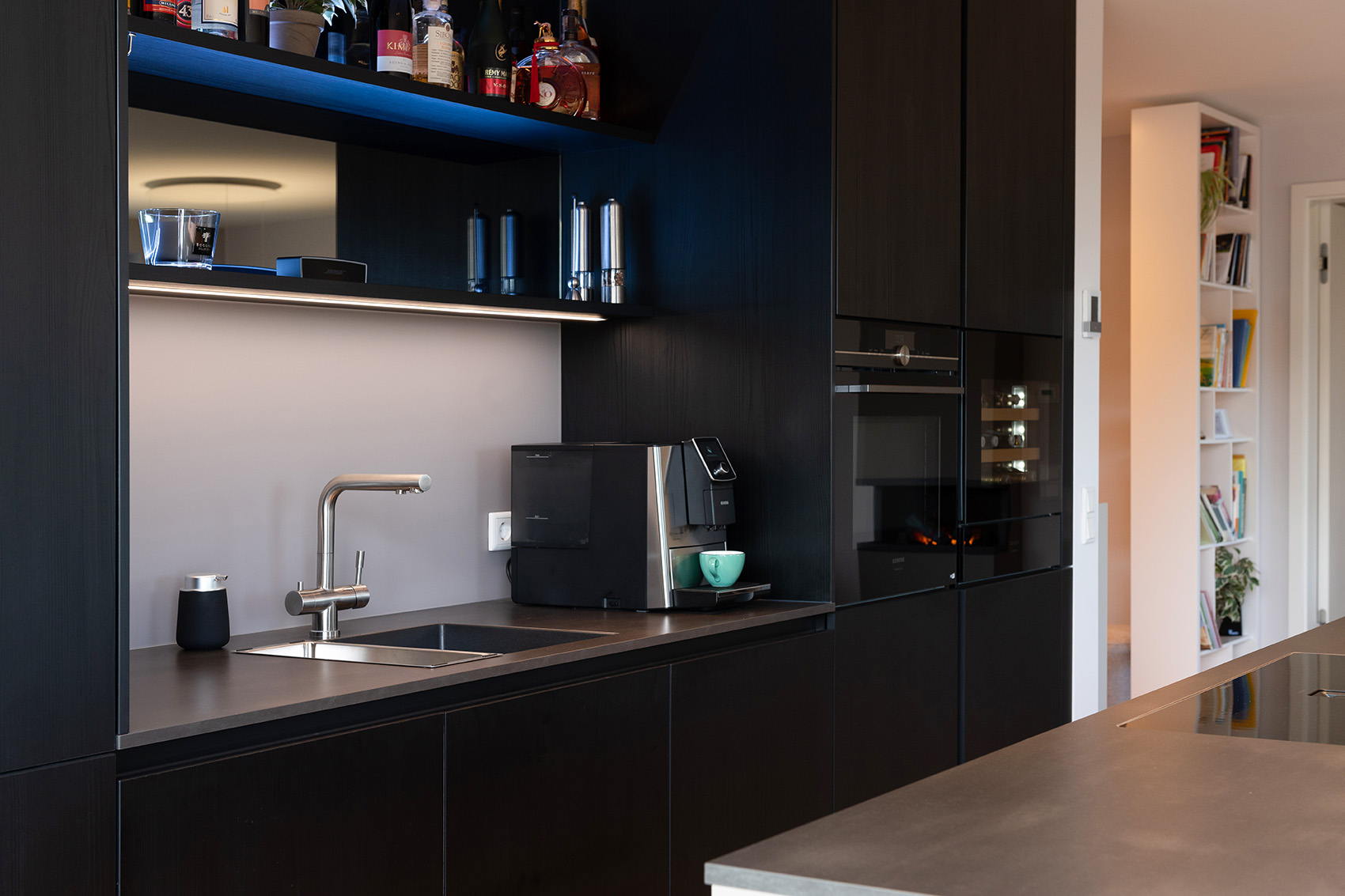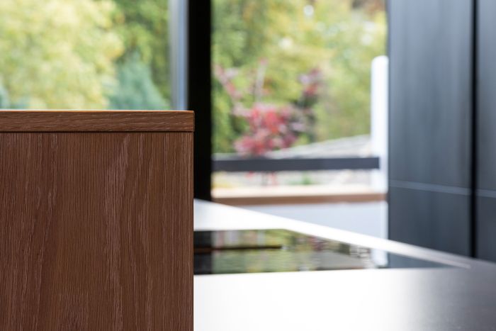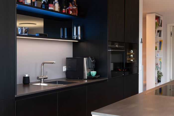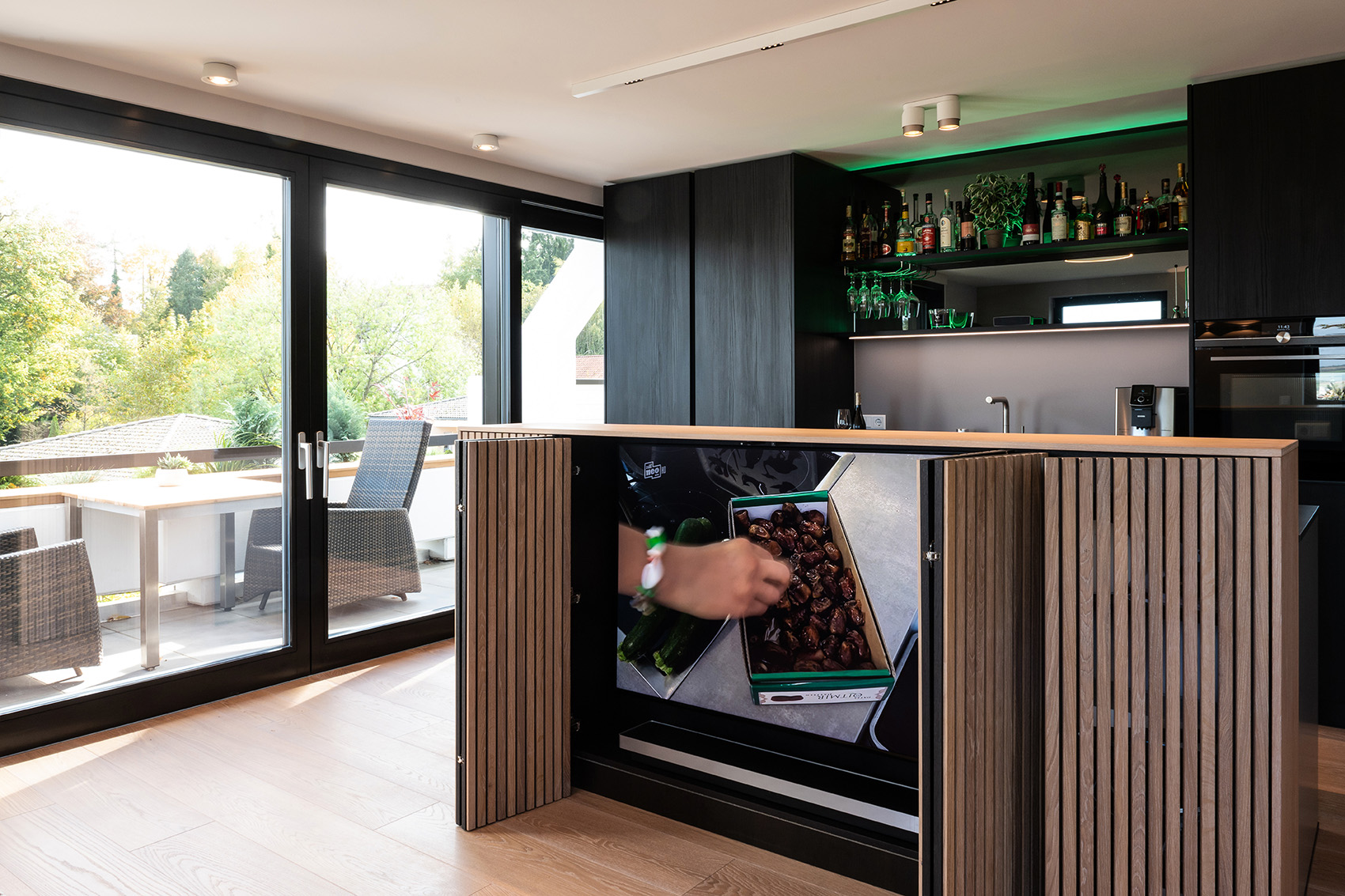Die hochwertige Strukturfichte in schwarz wirkt schon für sich allein edel. Die offenen Regale in der Küchenrückwand und die abgestufte Kücheninsel integrieren die eigentliche Küche perfekt in den offenen Wohnbereich. Alles ist wohnlich und gleichzeitig klar strukturiert. Plus: Im Akustikpaneel der Kücheninsel verbirgt sich der Fernseher – Form und Funktion sind hier perfekt vereint.