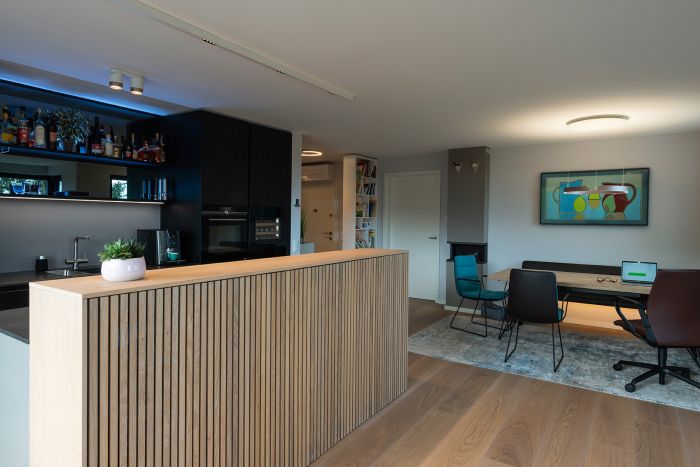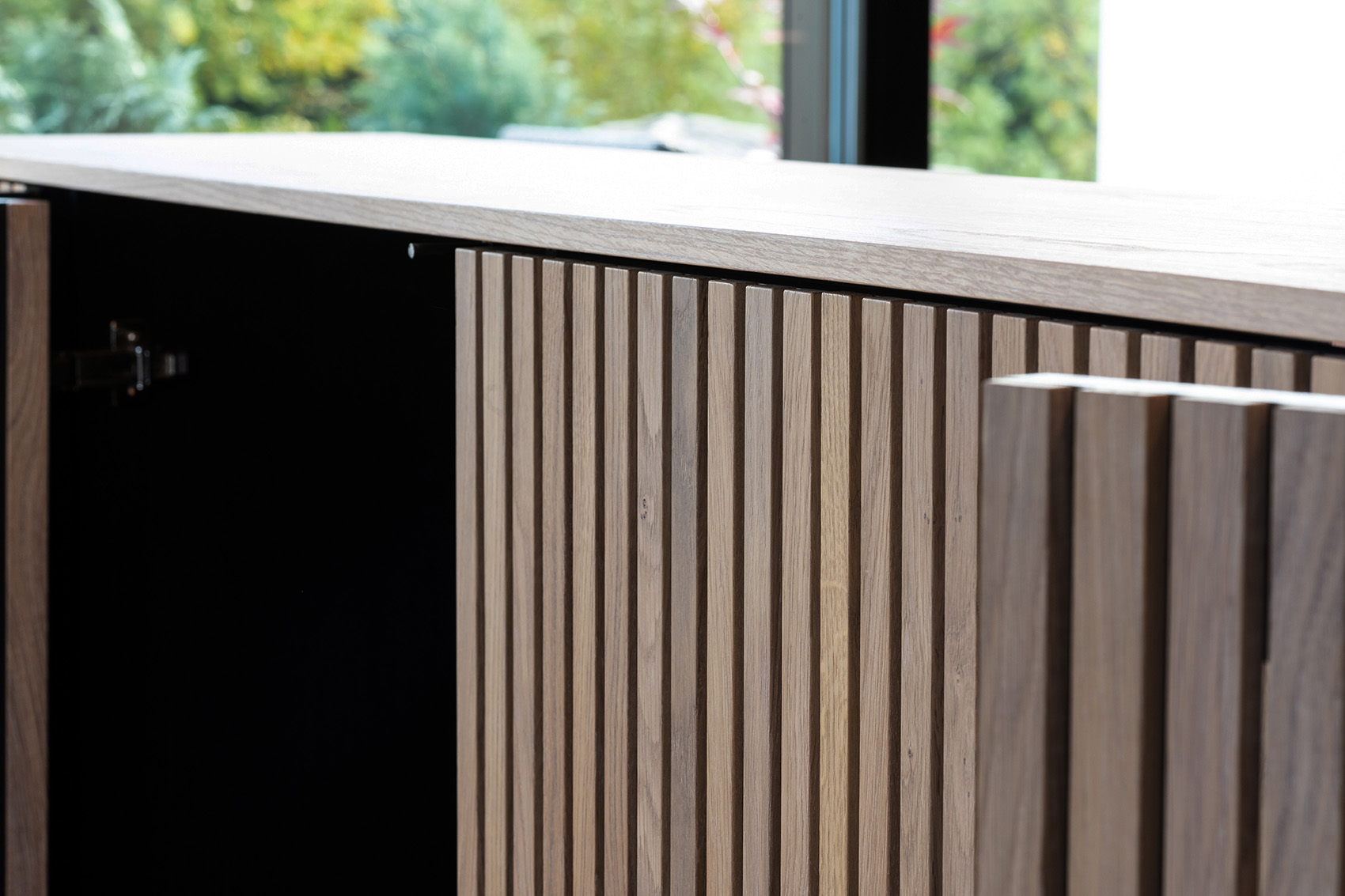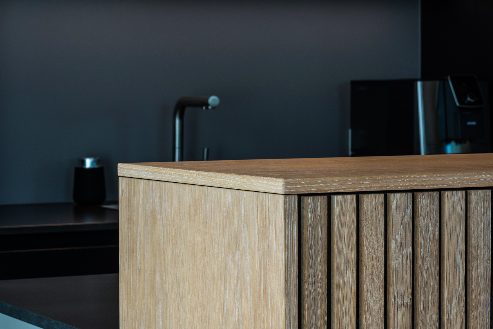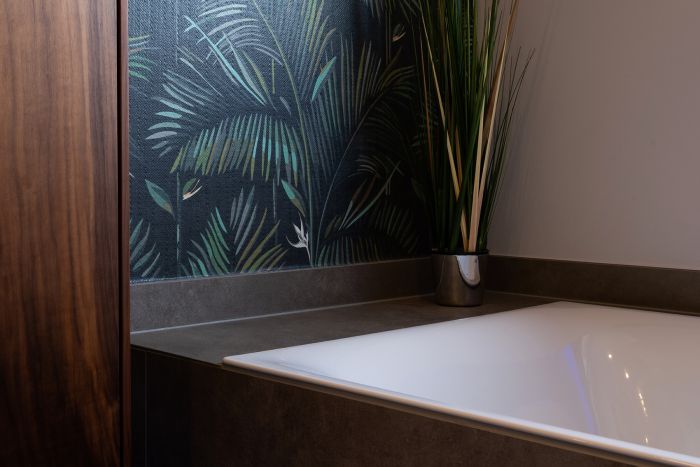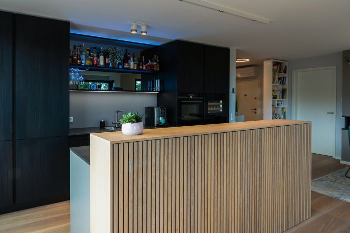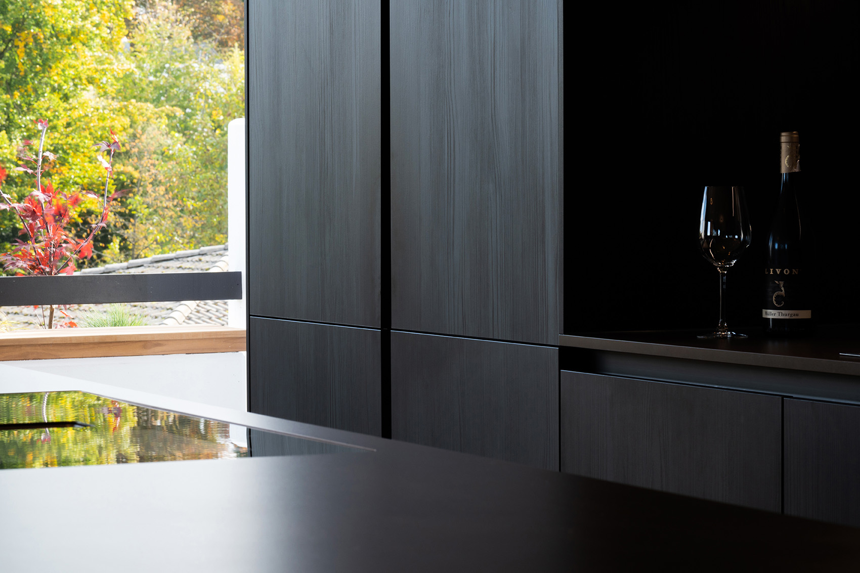 Die hochwertige Strukturfichte in schwarz wirkt schon für sich allein edel. Die offenen Regale in der Küchenrückwand und die abgestufte Kücheninsel integrieren die eigentliche Küche perfekt in den offenen Wohnbereich. Alles ist wohnlich und gleichzeitig klar strukturiert. Plus: Im Akustikpaneel der Kücheninsel verbirgt sich der Fernseher – Form und Funktion sind hier perfekt vereint.
