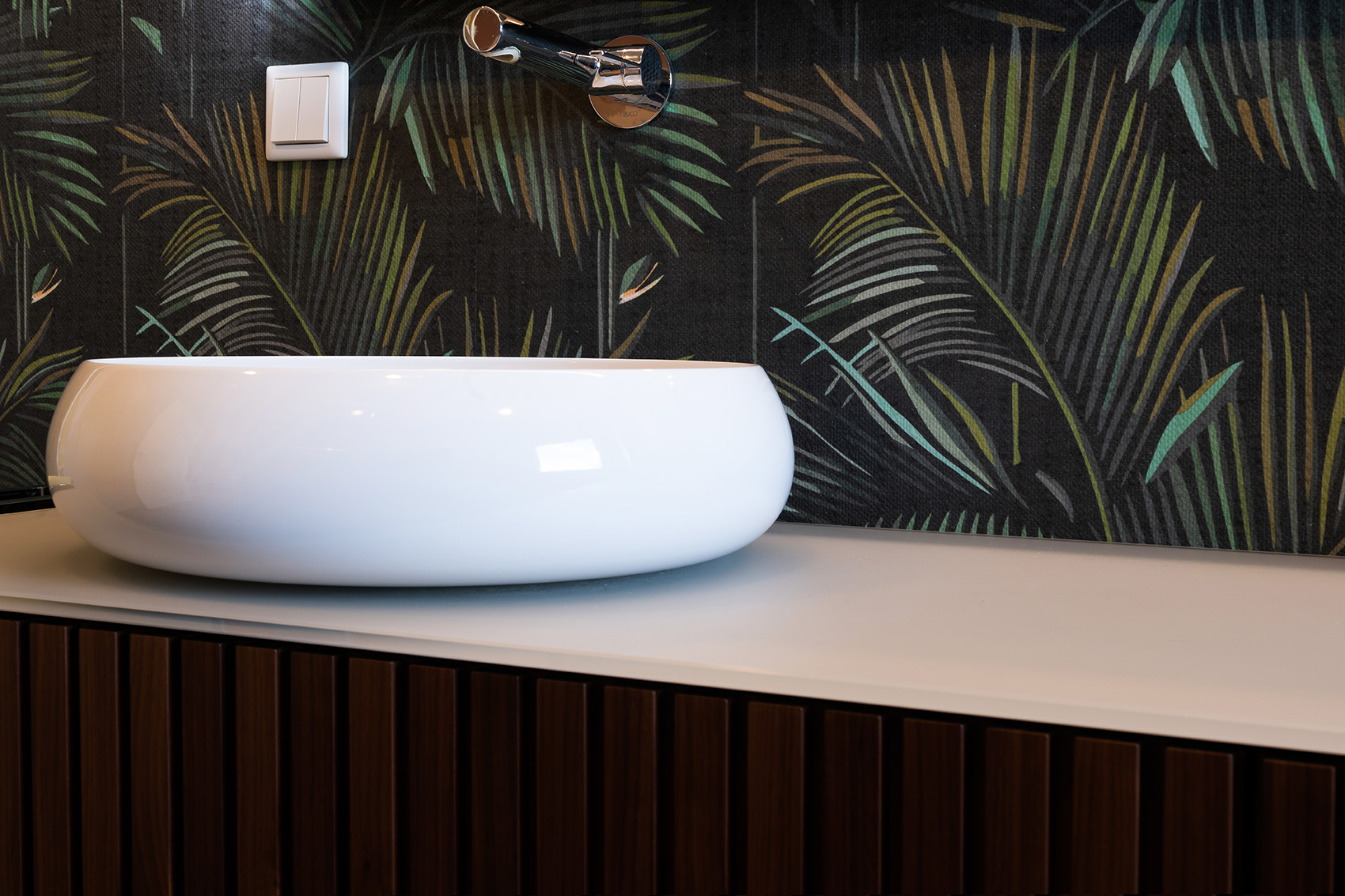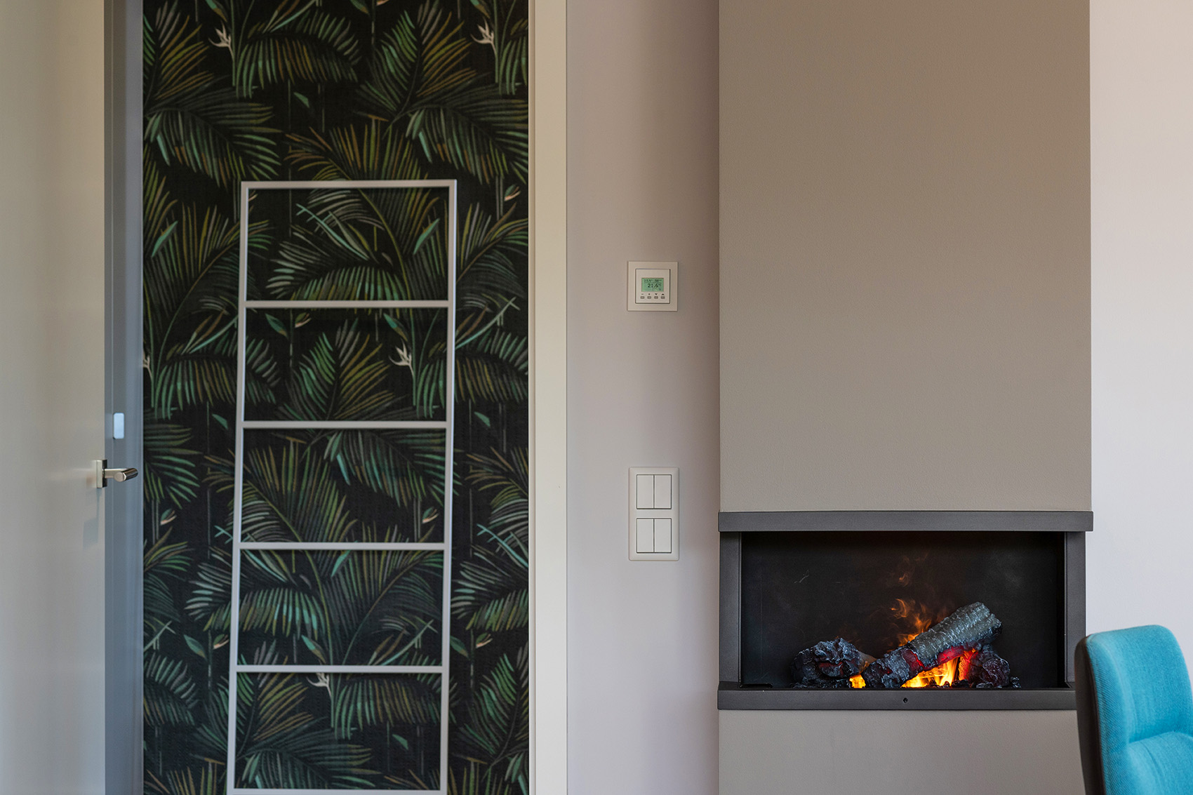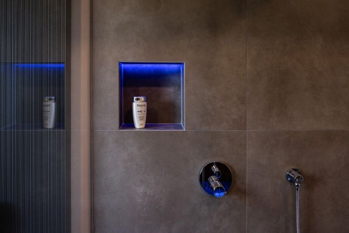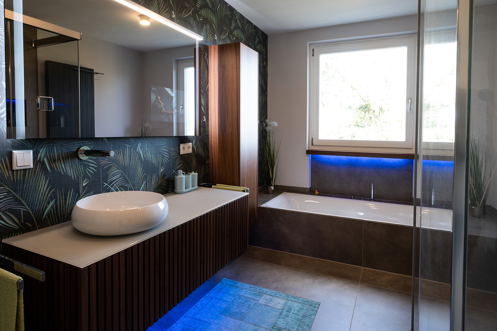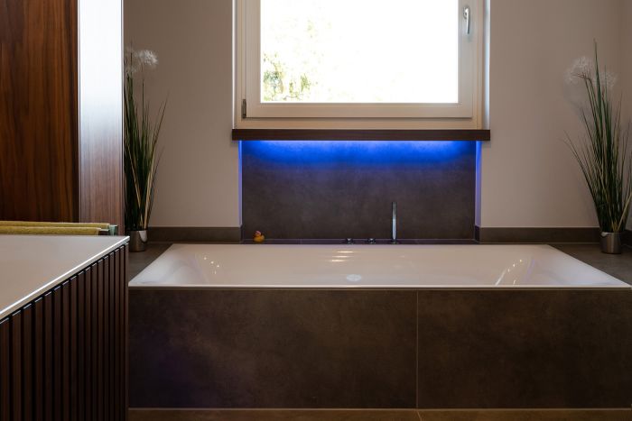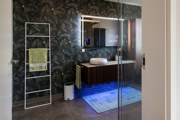 Die hochwertige Strukturfichte in schwarz wirkt schon für sich allein edel. Die offenen Regale in der Küchenrückwand und die abgestufte Kücheninsel integrieren die eigentliche Küche perfekt in den offenen Wohnbereich. Alles ist wohnlich und gleichzeitig klar strukturiert. Plus: Im Akustikpaneel der Kücheninsel verbirgt sich der Fernseher – Form und Funktion sind hier perfekt vereint.