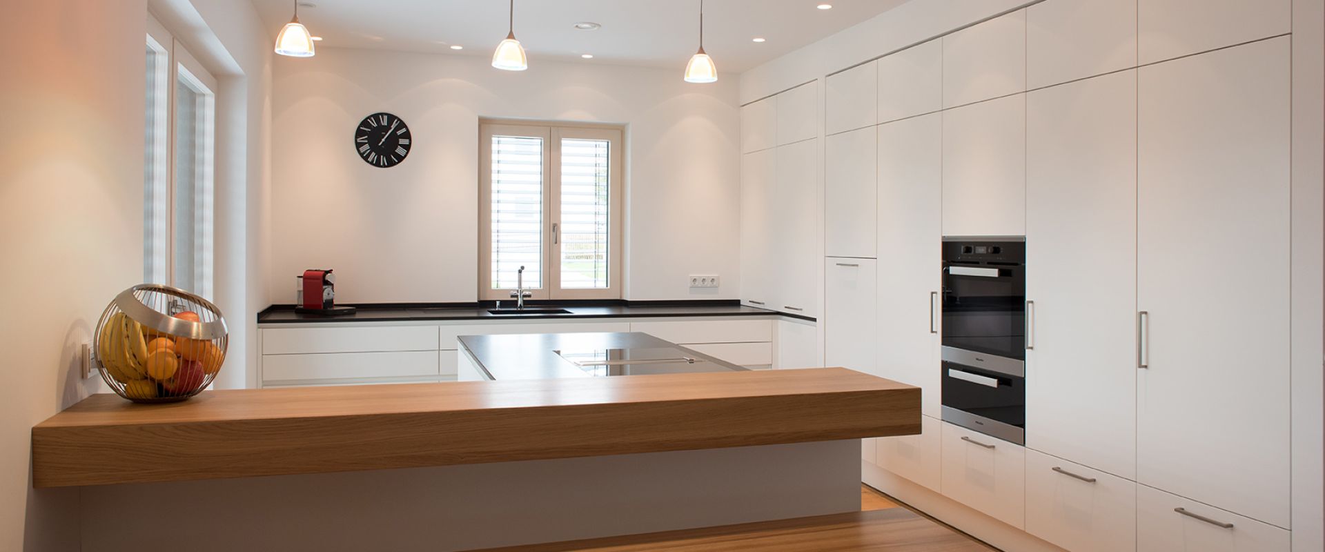 Zeitlose Eleganz mit hellen Fronten und angesetzten Echtholztresen. Und der Hingucker schlechthin: eine schwarze Arbeitsplatte.