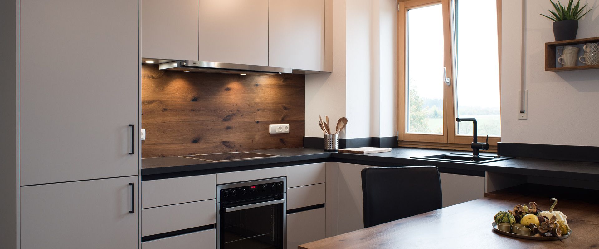 Esstisch und Küchenrückwand sind aus altem Eichenholz in warmen Karamelltönen gefertigt. Sie ergänzen den klassischen Stil der Fronten aus neu entdecktem Resopal: belastbar, schlicht und modern in einem.