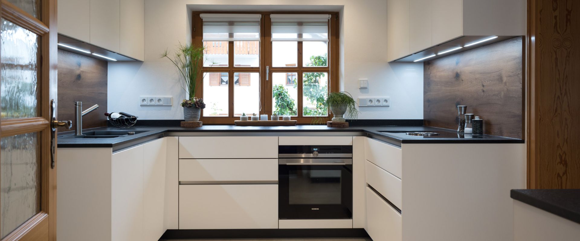 Klare Formensprache an den Fronten und warme Altholztöne in der Küchennische – so schön kann die klassische Küche sein! Moderne Küchentechnik inklusive, der Kochfeldabzug und die dezente Beleuchtung in Form von Spots und Hochschrankleuchten sind da nur zwei Beispiele, von vielen.