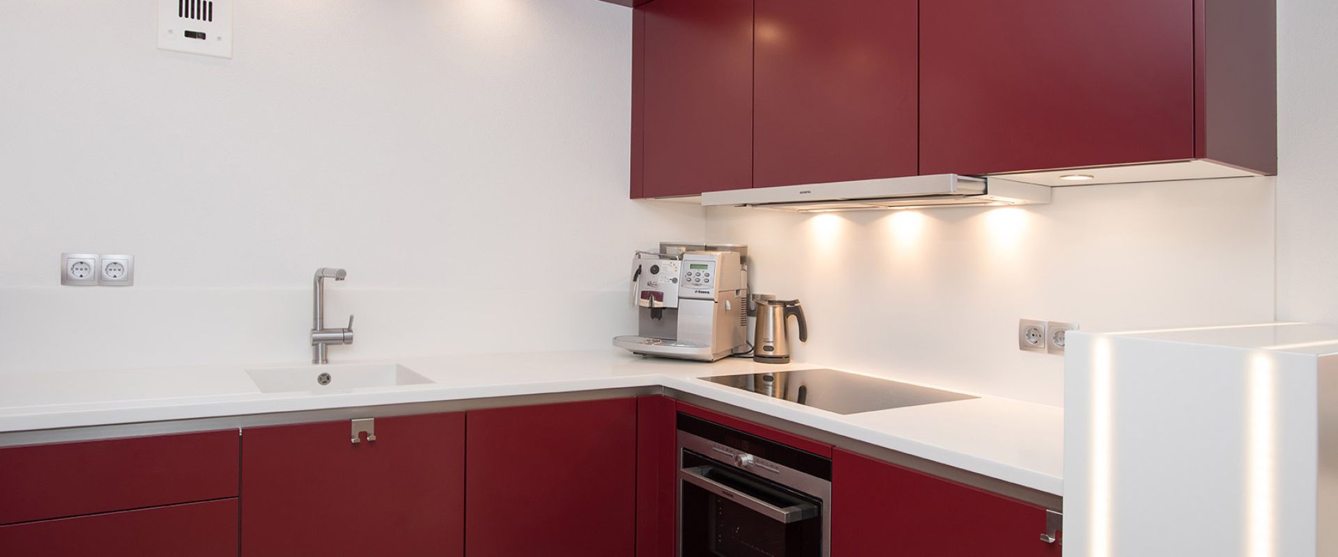 Rot wie die Liebe – oder in diesem Falle, wie die perfekte Küche! Klassische grifflose Fronten in hochglänzendem roten Lackkleid geben dieser Küche ein unverwechselbares Gesicht.
