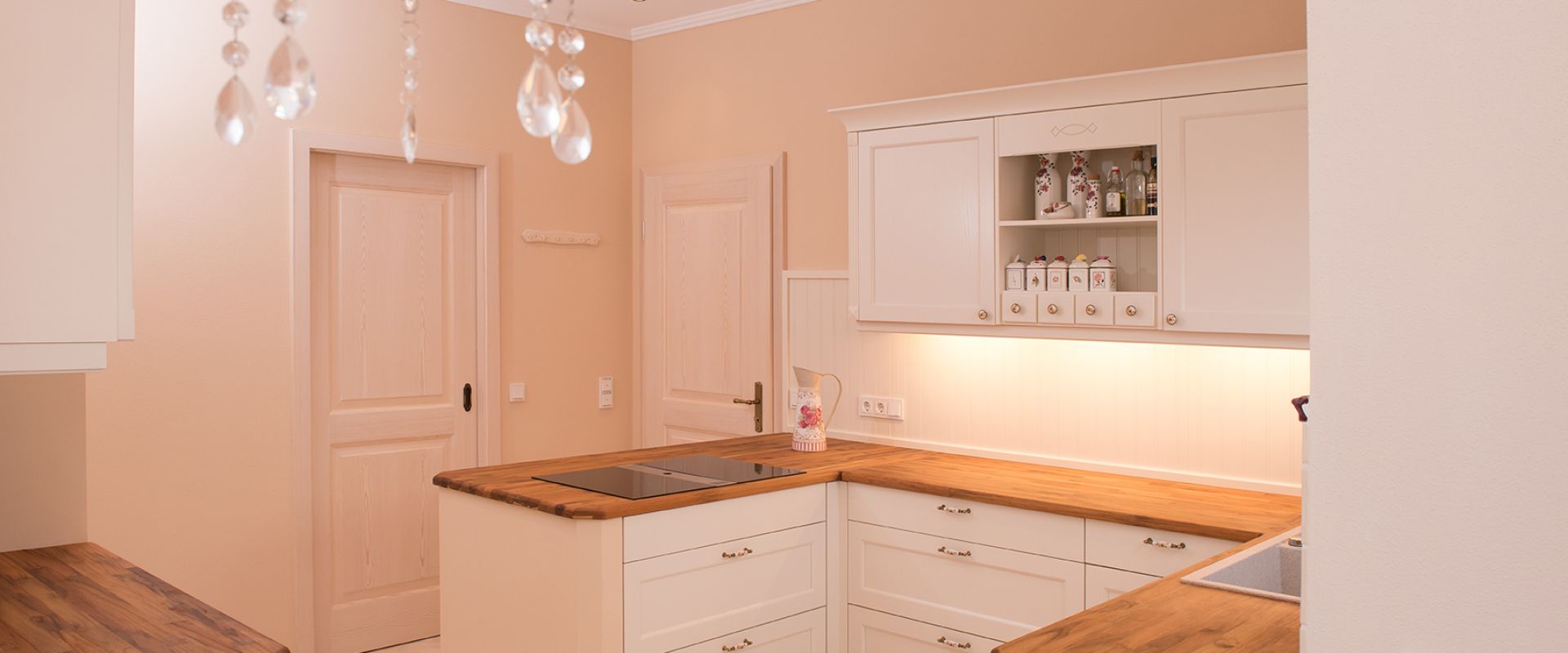Moderner Landhauschic, von der Planung bis zur Fertigung aus unserer Hand. Der U-förmige Arbeitsbereich mit Echtholz-Arbeitsplatte ist da nur ein Highlight.