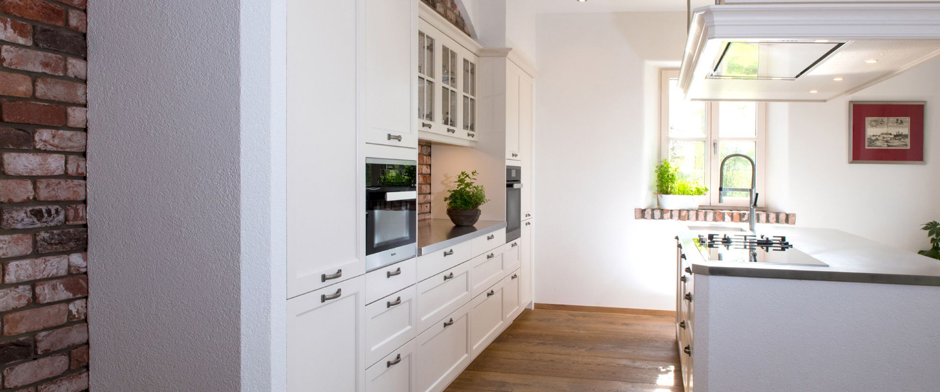 Klassisch elegant und modern in einem: Zarte Weißtöne in den Fronten und pflegeleichte Edelstahl-Arbeitsflächen gehen bei dieser modernen Landhaus-Küche eine perfekte Symbiose ein.