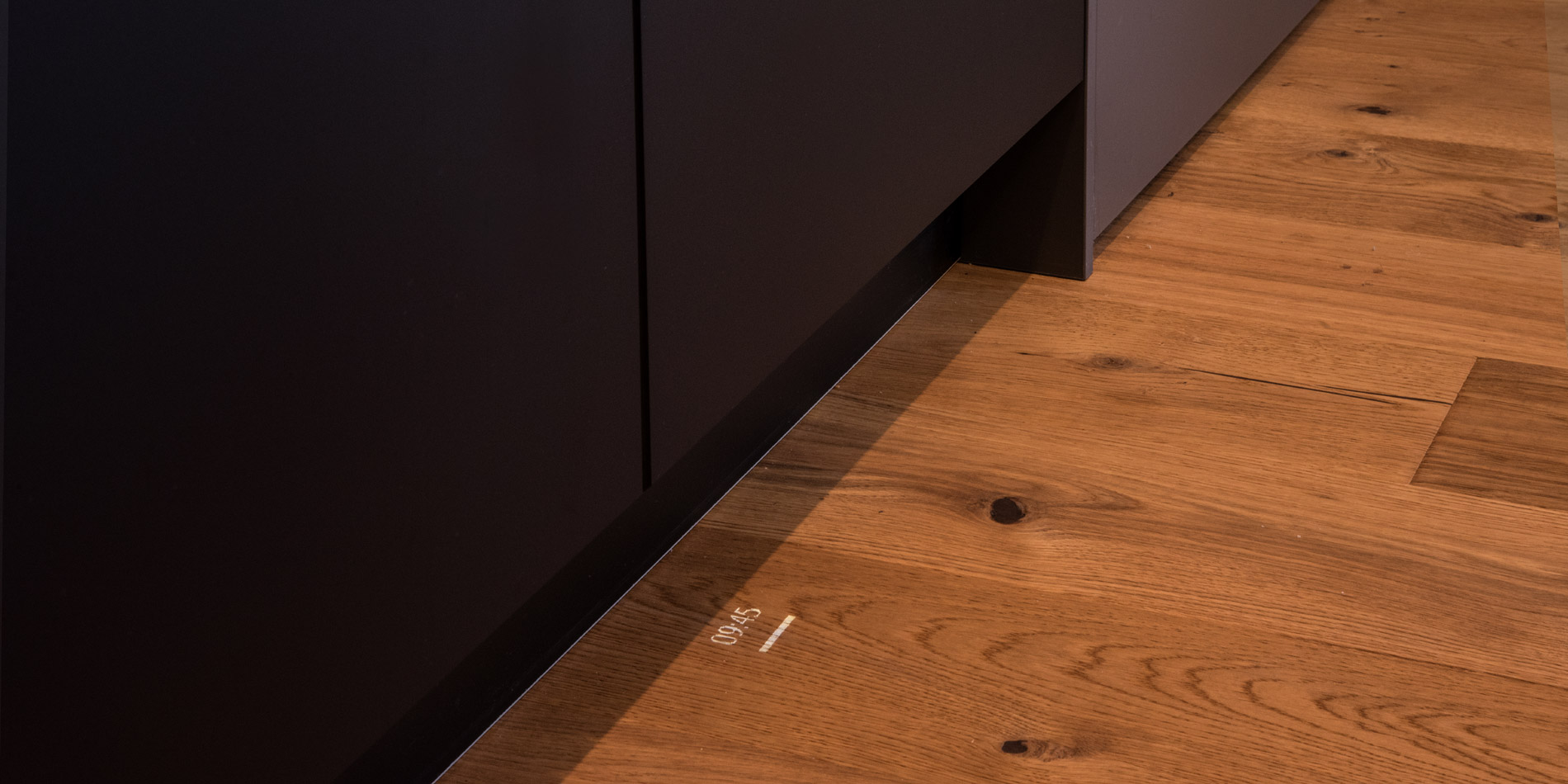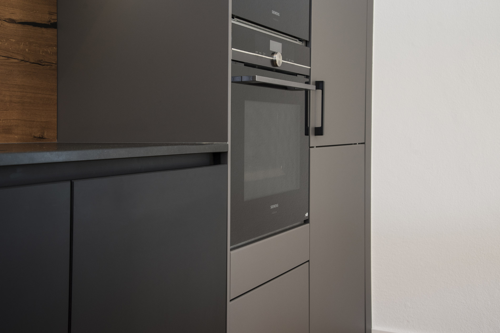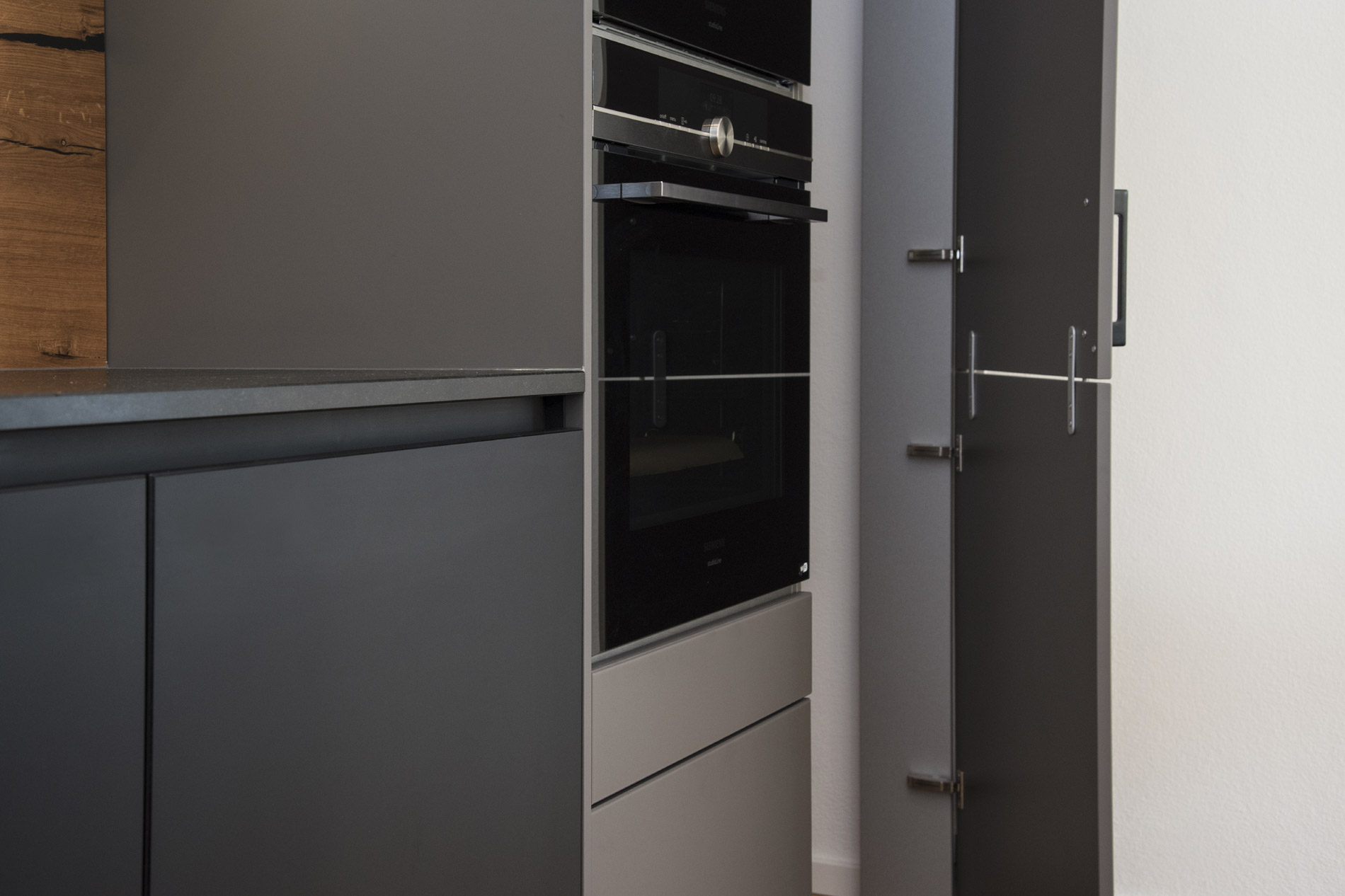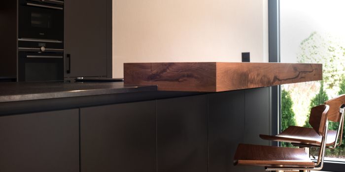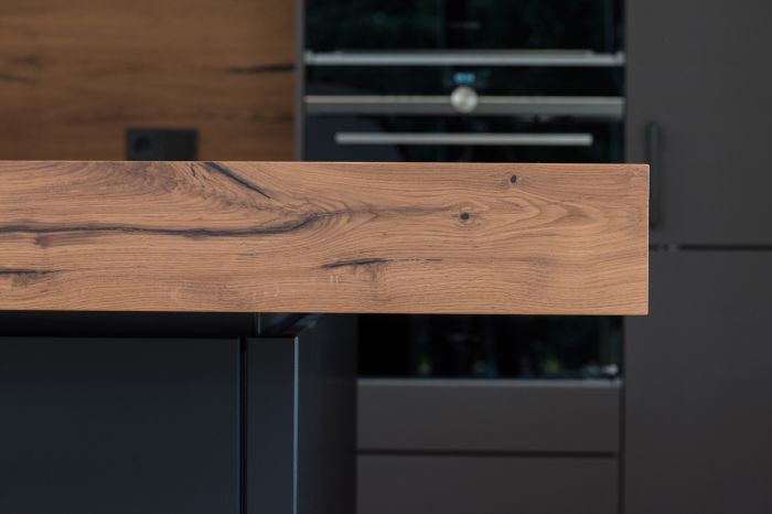 Immerhin ist das polymere Glas besonders widerstandsfähig und sehr pflegeleicht. Damit von den samtig-matten Fronten nichts ablenkt, ist der Geschirrspüler mit Bodendisplay ausgestattet. Nischenverkleidung und Tresen-Aufsatz sind aus Altholzbeständen entstanden.