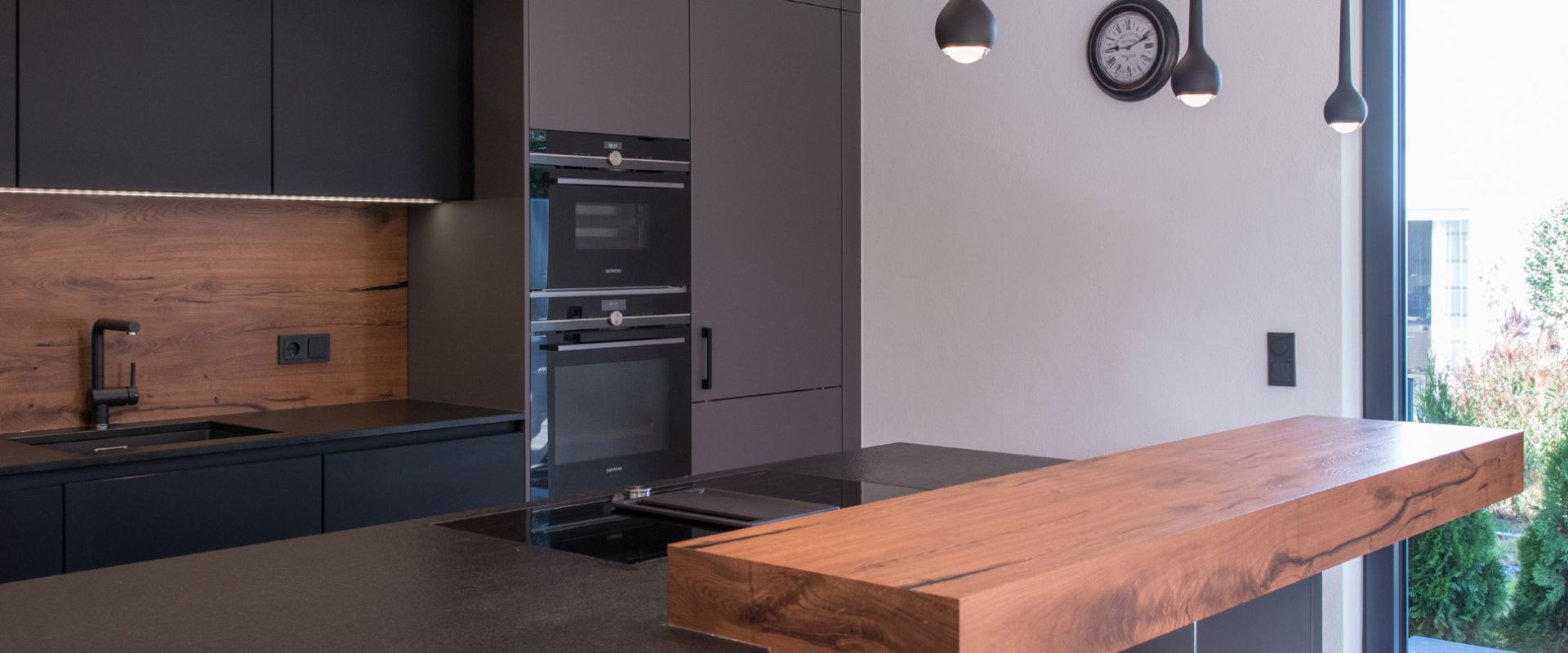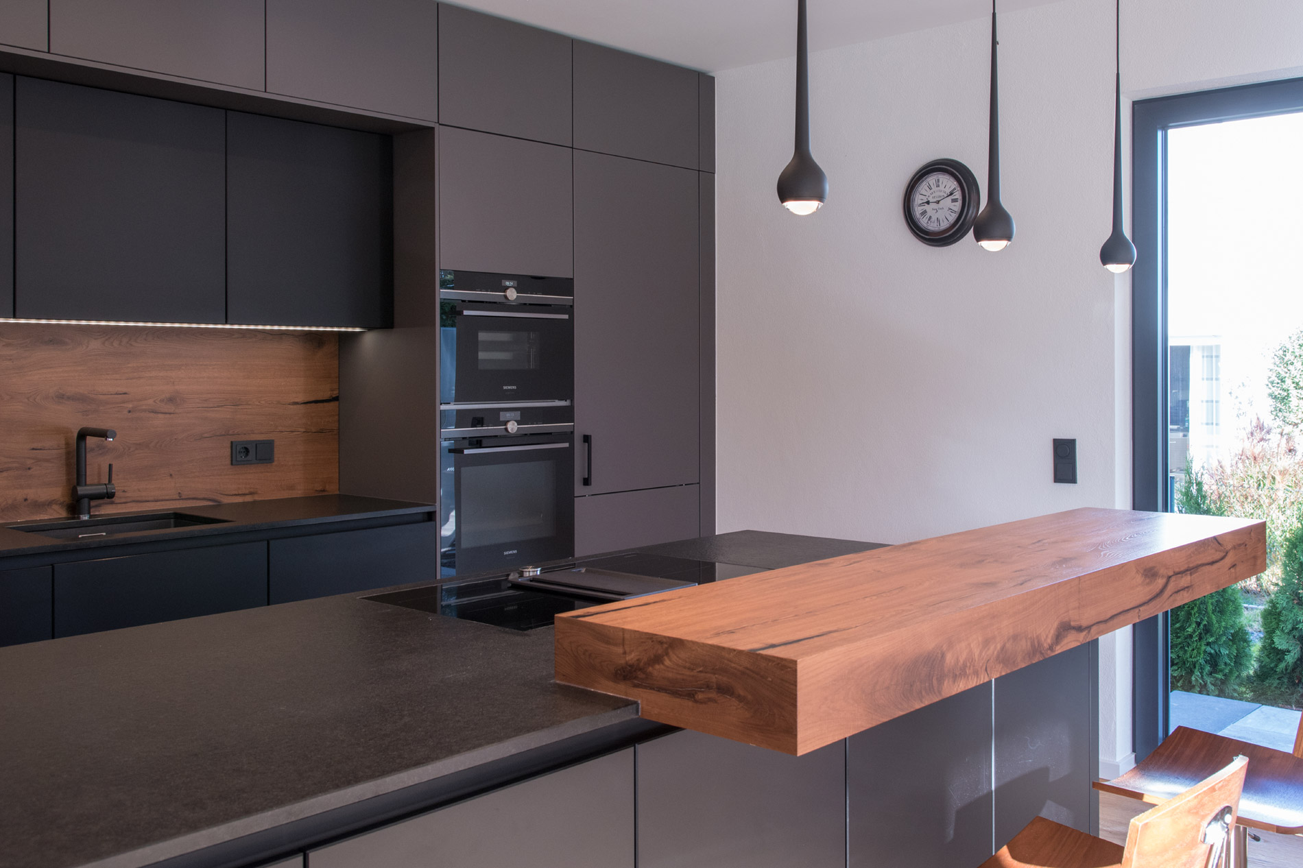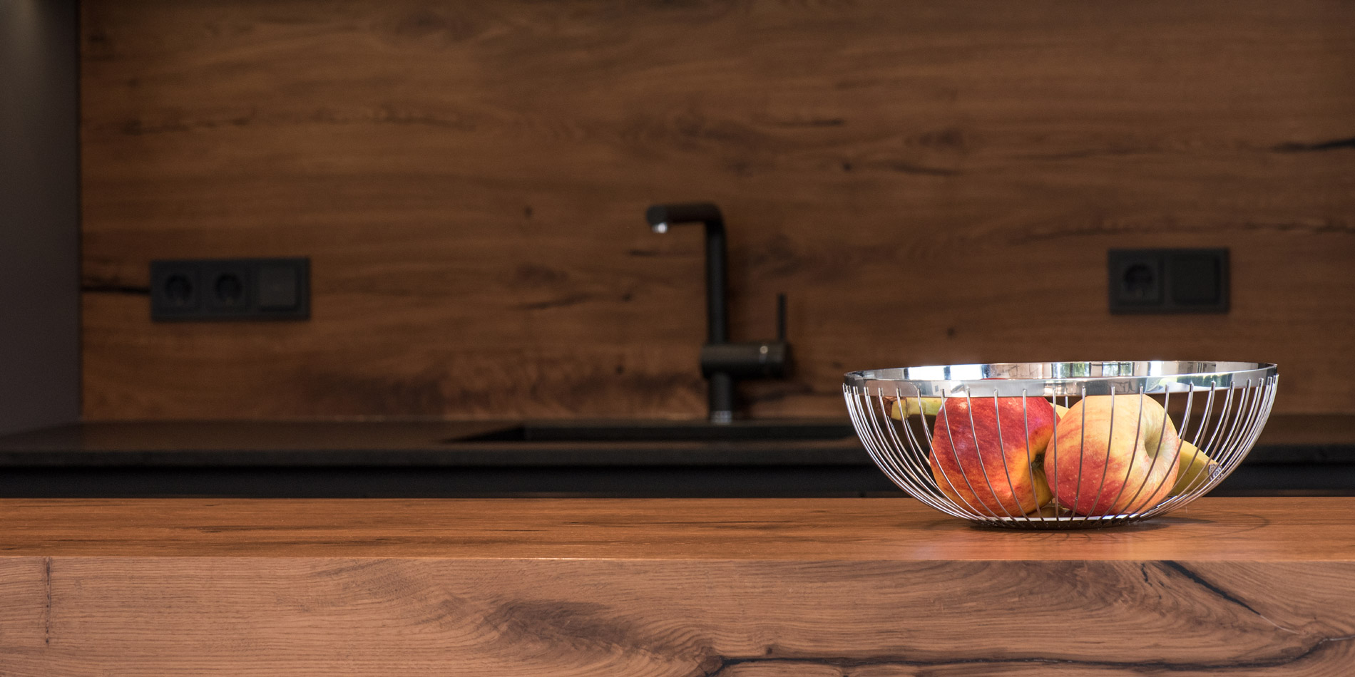 Immerhin ist das polymere Glas besonders widerstandsfähig und sehr pflegeleicht. Damit von den samtig-matten Fronten nichts ablenkt, ist der Geschirrspüler mit Bodendisplay ausgestattet. Nischenverkleidung und Tresen-Aufsatz sind aus Altholzbeständen entstanden.