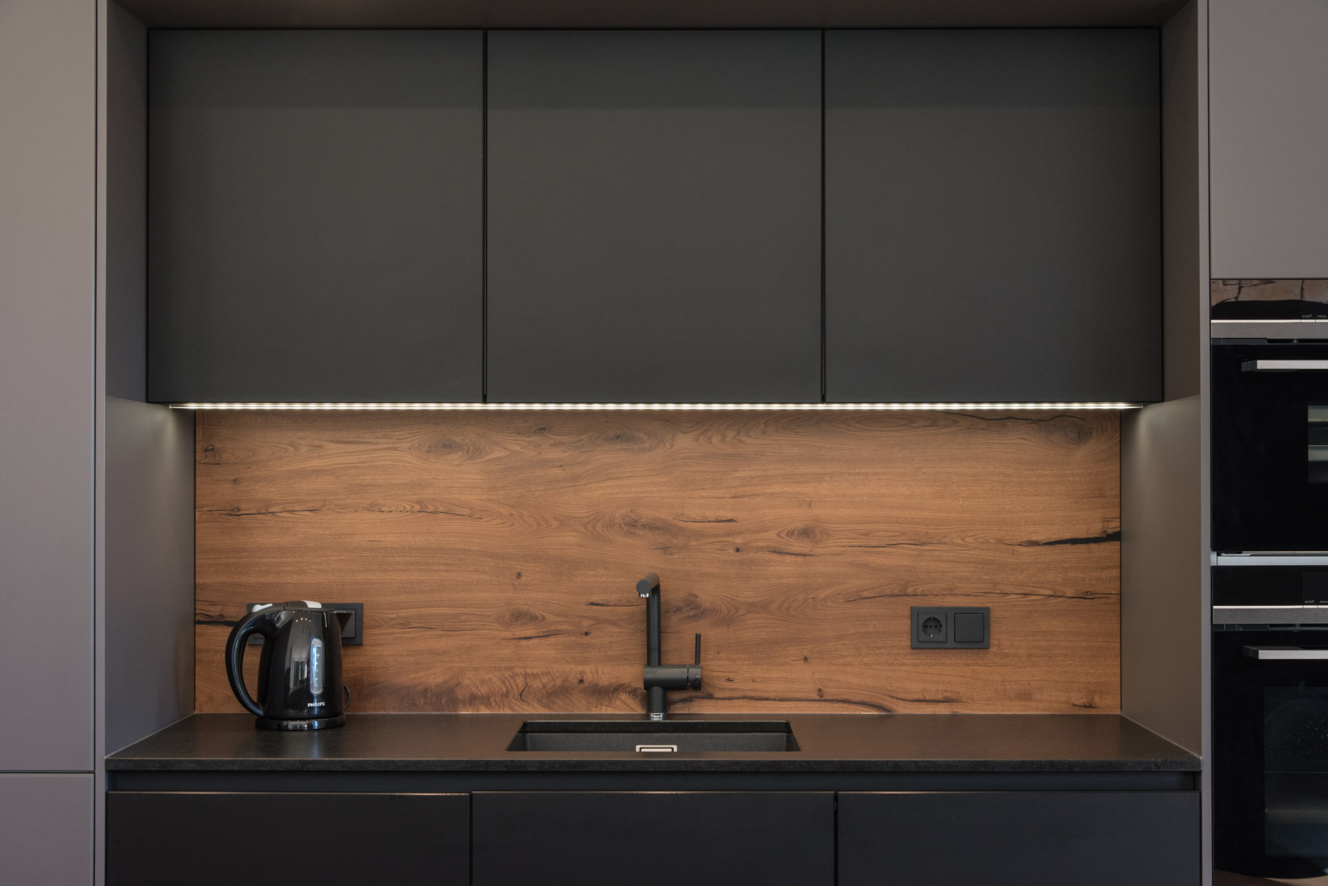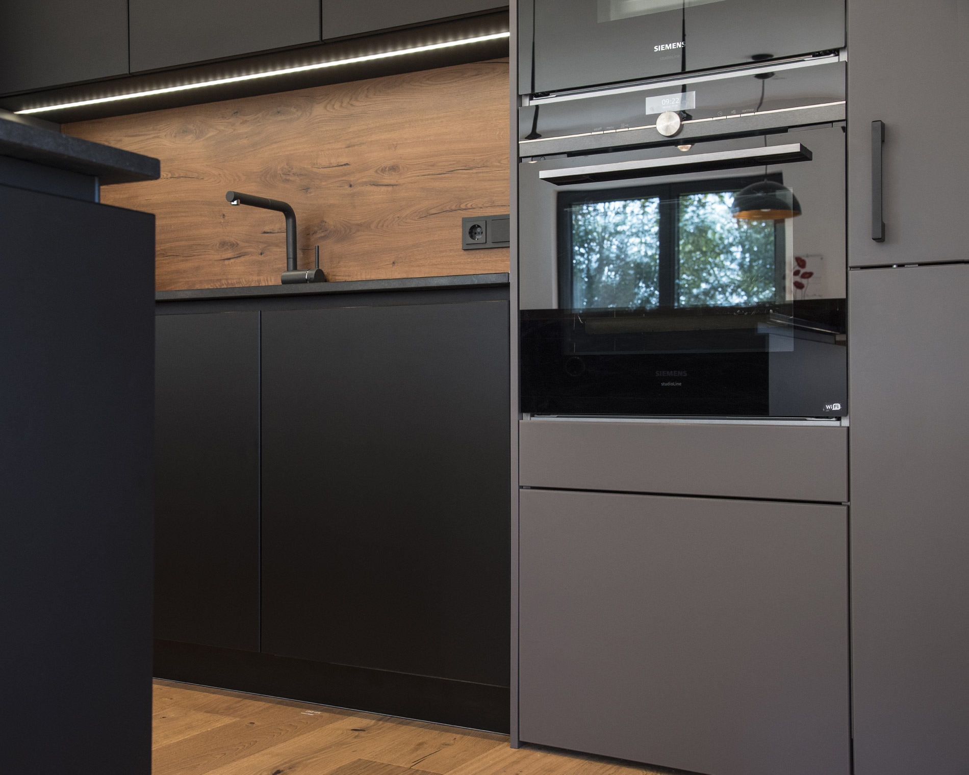 Polymeres Glas als Material für Küchenfronten? Wer die samtige Textur nicht selbst erstreichelt hat, kann sich das Gefühl nicht wirklich vorstellen! Und das ist nur ein Highlight dieser besonderen modernen Küche.