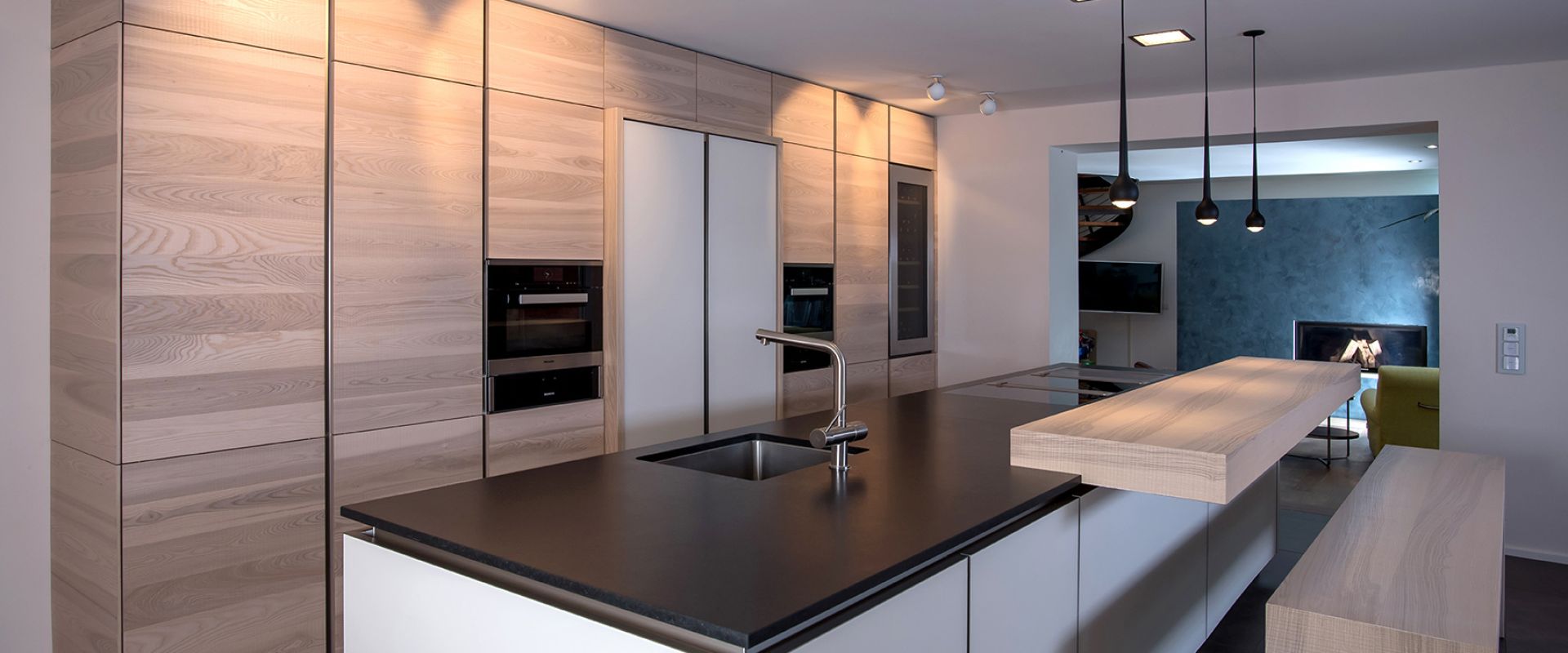 Gut versteckt ist dagegen die Eingangstüre zur Nebenküche, die über zwei integrierte Schiebetüren erreicht wird. Der angesetzte Tresen ist aus massiver Esche und lädt eindeutig zum längeren Verweilen ein.
