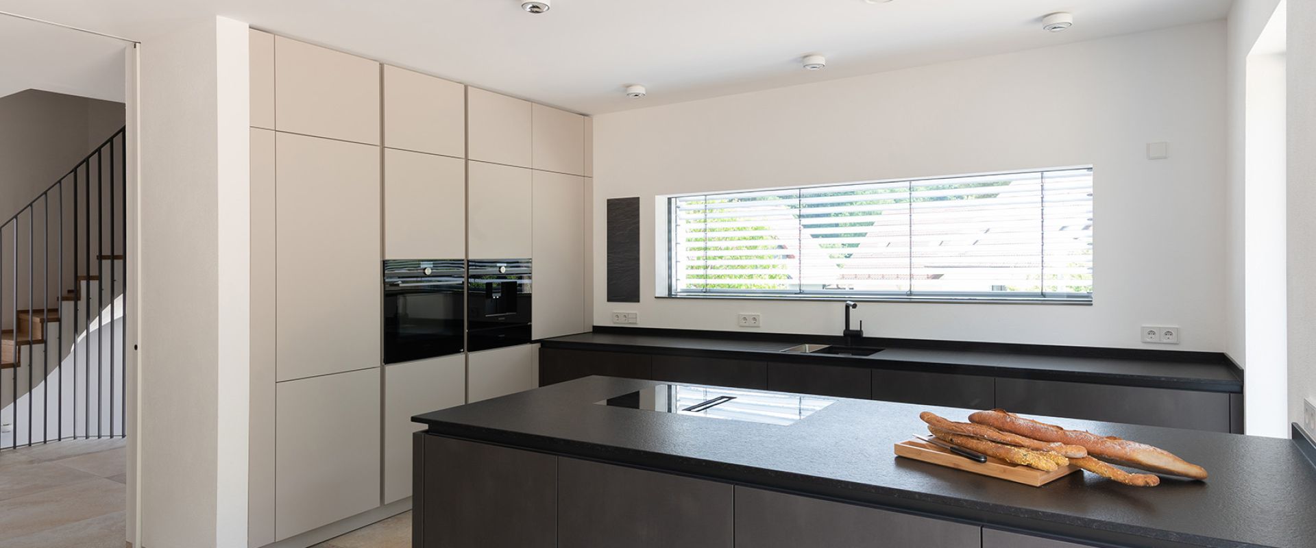 Der unverwechselbare Naturstein Nero Assoluto ziert die Arbeitsfläche, er ist bekannt für seine glatte und äußerst robuste Struktur. Dezente Griffmulden in Lavaschwarz nehmen den eleganten Stil auf. Kein Haken, kein Griff und kein Knauf lenken von der beeindruckend schlichten Klarheit der Linien in dieser Küche ab.