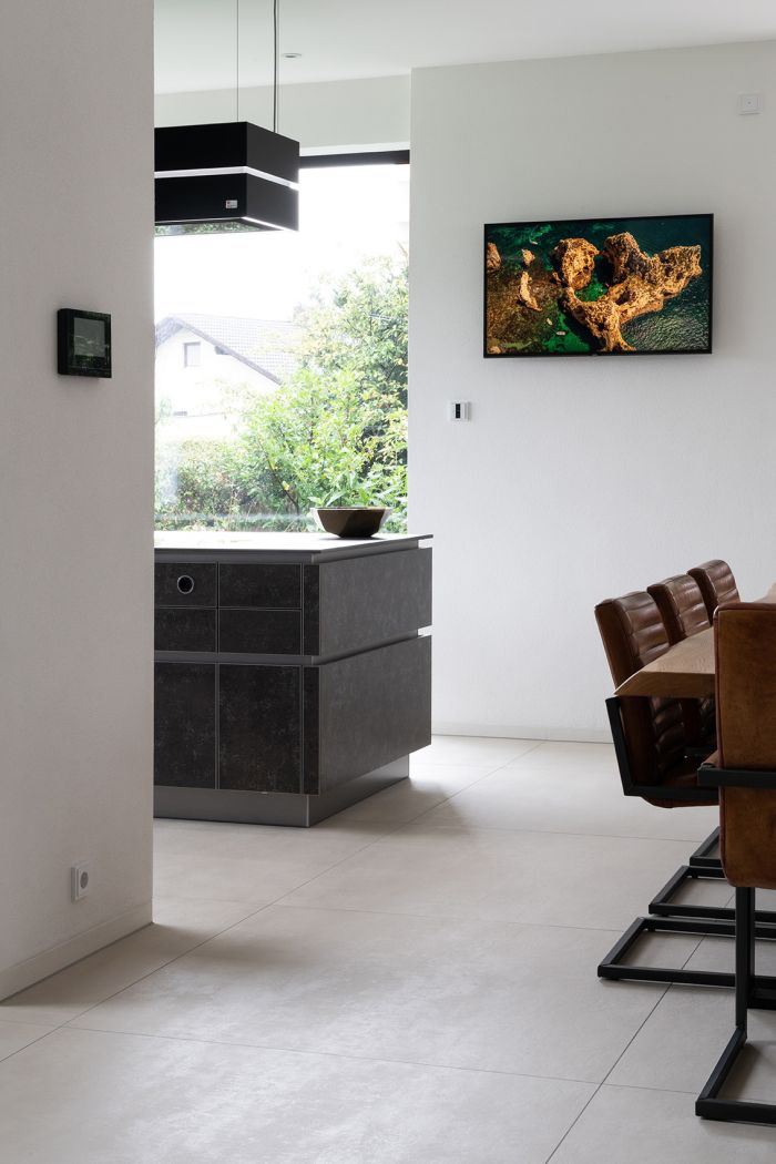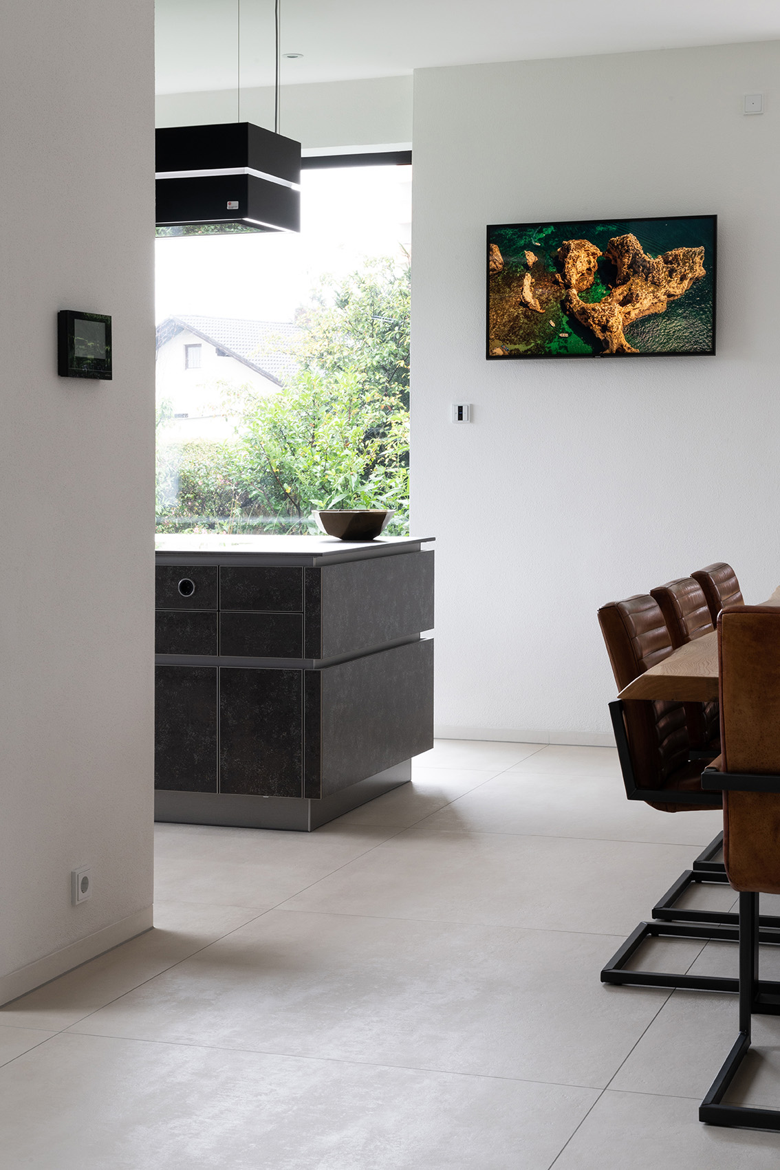 Sieht aus wie Glas, ist aber keramisch: Die Keramik-Fronten dieser Küche in satiniertem Taupe harmonieren wunderbar mit dem angrenzenden Essbereich. Passt perfekt dazu: Eine Keramik-Arbeitsplatte, die belastbar und hitzebeständig ist. Die perfekte Grundlage für große und kleine Kochgelage. Die dabei entstehenden Kochdämpfe fängt die frei hängende Berbel-Deckenhaube ein. Auf Knopfdruck gleitet sie sanft von der Decke in Richtung Kochfeld und entfaltet dort im optimalen Abstand zum Kochfeld die volle Berbel-Kraft.