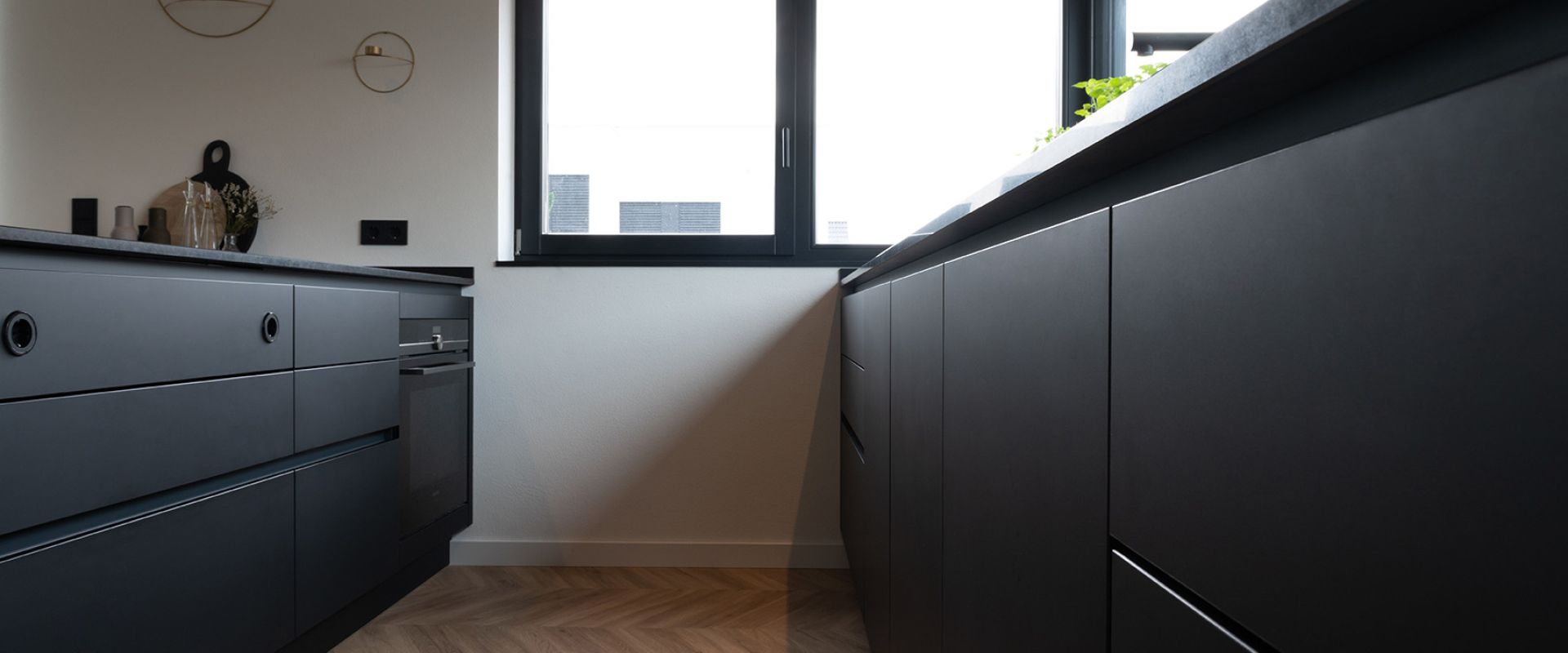 Keine Kratzer, keine Fingerabdrücke, keine Flecken. Dafür lebensmittelecht und dauerhaft schön anzusehen sind die geradlinigen Fronten der modernen Küche. Die helle Hochschrankwand nimmt diese Geradlinigkeit auf. Mit schwarzen Griffleisten, die perfekt auf die restliche mattschwarze Küche abgestimmt sind.