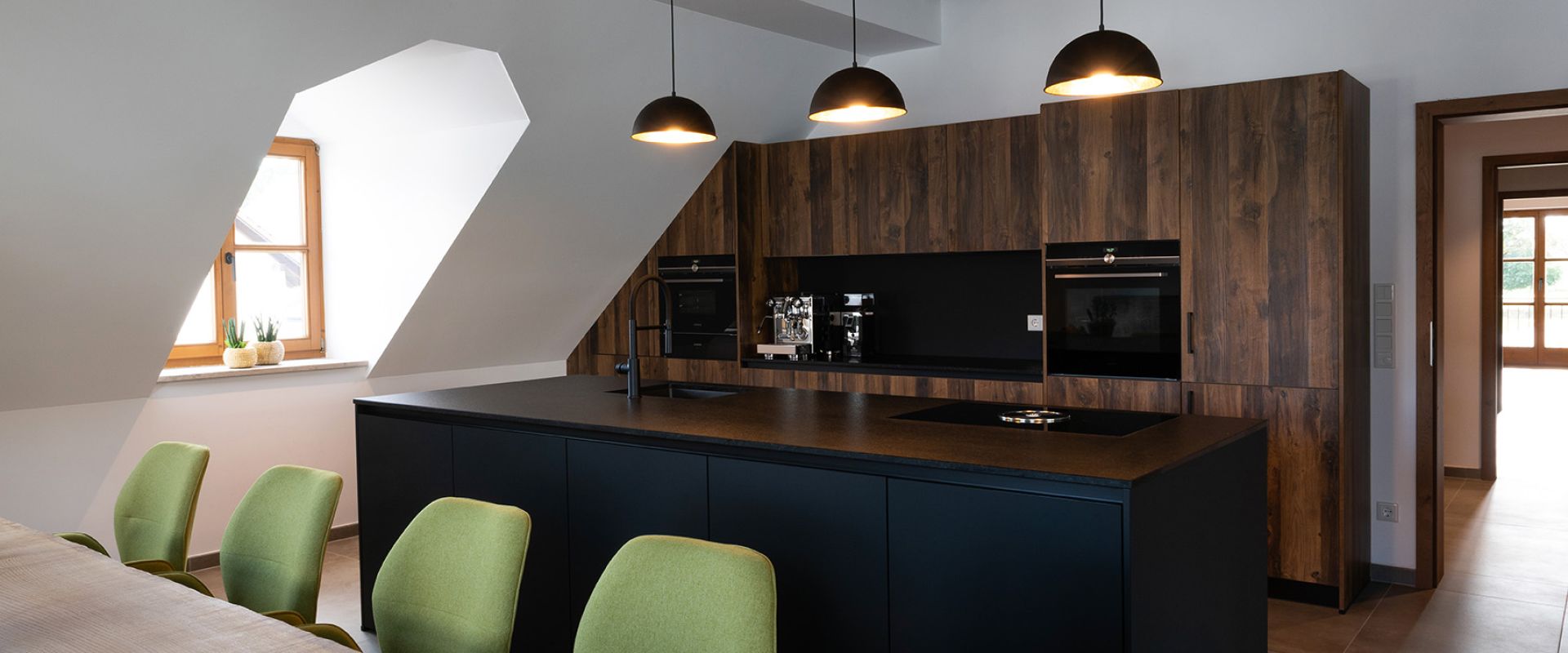 Dachschrägen und rustikale Holzbalken geben den Rahmen vor. Da fügt sich die Küche in Chaleteiche und Onyxschwarz perfekt ein.