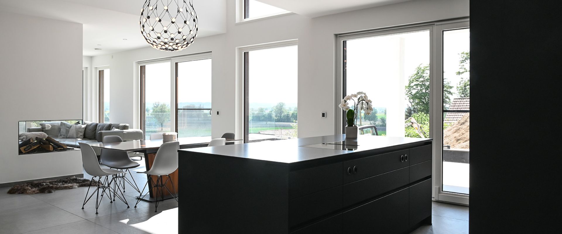 Ein Highlight der modernen Küche in mattem Onyxschwarz ist ohne Frage das integrierte Coffeecenter und der zum Wohnzimmer hin platzierte Weinkühlschrank im Küchenblock.