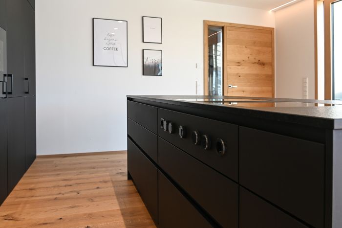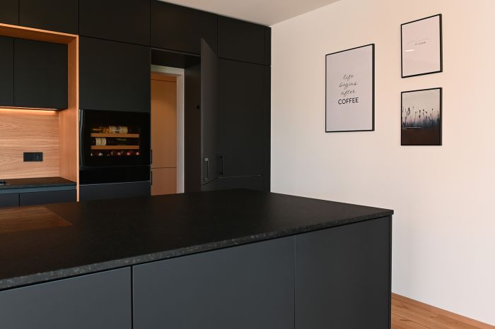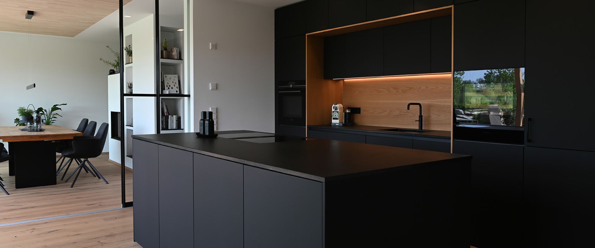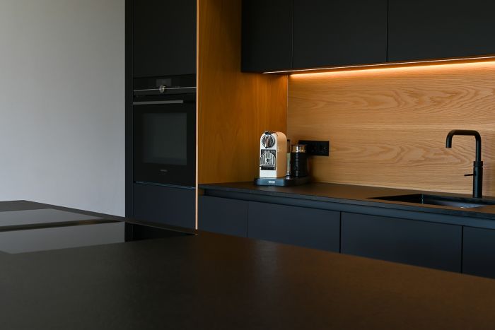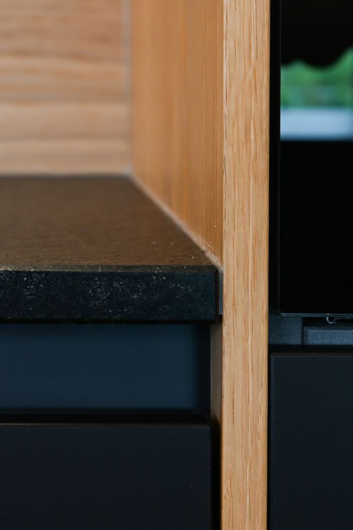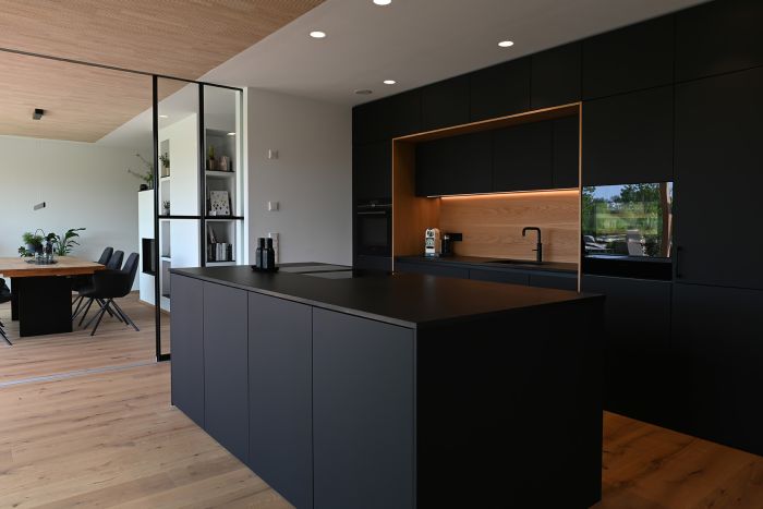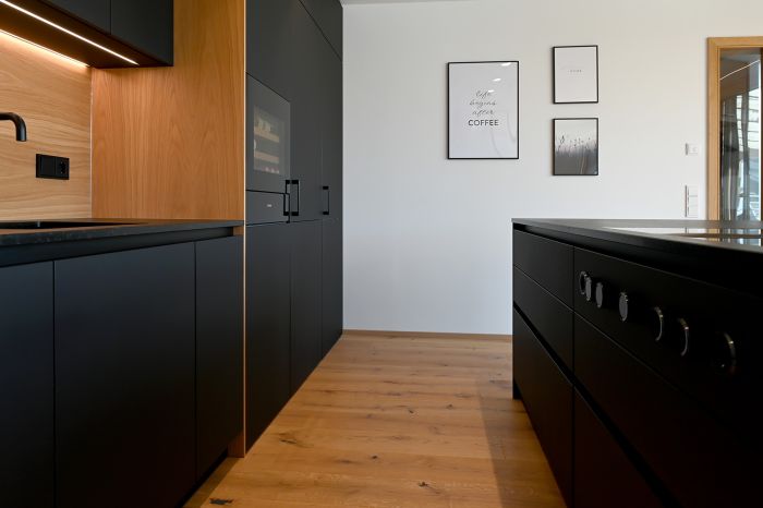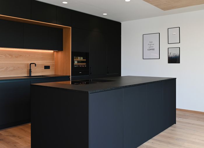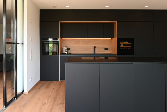 Die Front in supermattem schwarzem RESOPAL® ist äußerst robust und die perfekte Wahl für engagierte Kochbegeisterte. Gut versteckt ist der Zugang zur Nebenküche hinter einem der Hochschränke. Mit einer Arbeitsplatte aus Nero Assoluto, einem tiefschwarzen und ebenso robusten Naturstein, wird die schlichte Eleganz dieser schönen Küche optimal unterstrichen. Der warme Holzfußboden und die Fortführung der Holzstruktur in der Küchenrückwand schaffen ein warmes Ambiente.