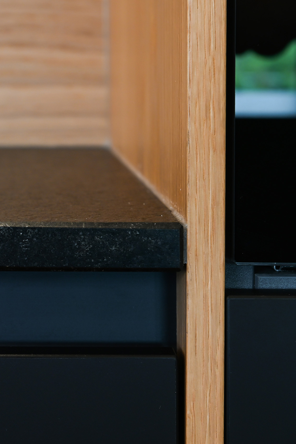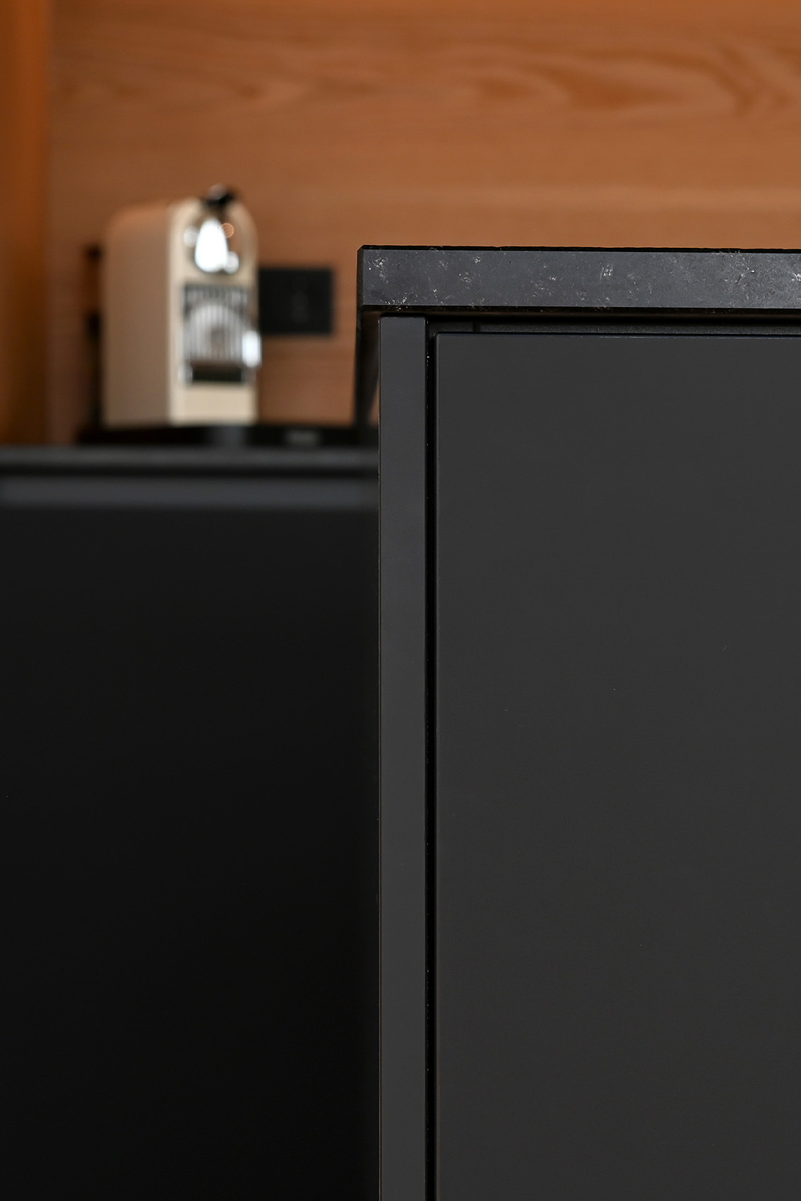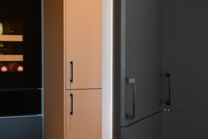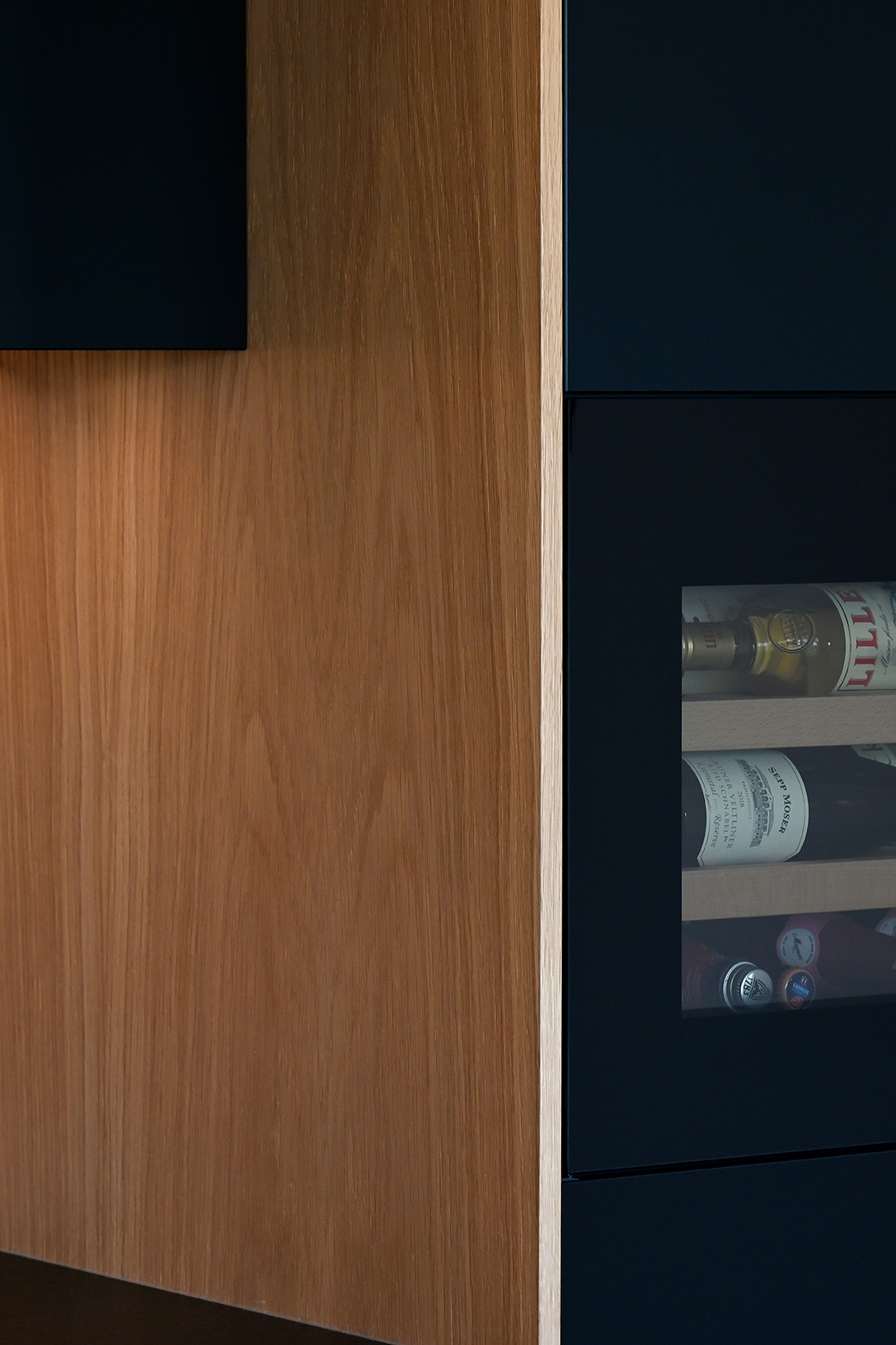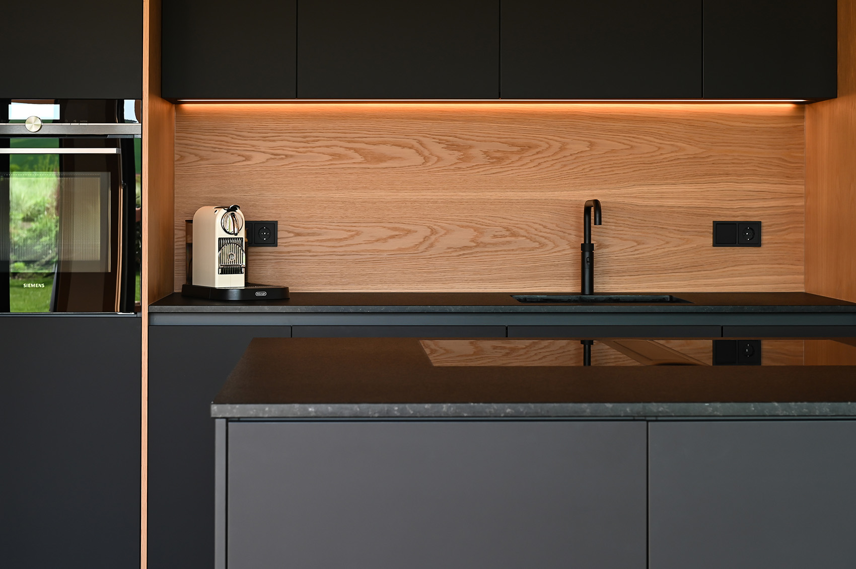 Die Front in supermattem schwarzem RESOPAL® ist äußerst robust und die perfekte Wahl für engagierte Kochbegeisterte. Gut versteckt ist der Zugang zur Nebenküche hinter einem der Hochschränke. Mit einer Arbeitsplatte aus Nero Assoluto, einem tiefschwarzen und ebenso robusten Naturstein, wird die schlichte Eleganz dieser schönen Küche optimal unterstrichen. Der warme Holzfußboden und die Fortführung der Holzstruktur in der Küchenrückwand schaffen ein warmes Ambiente.