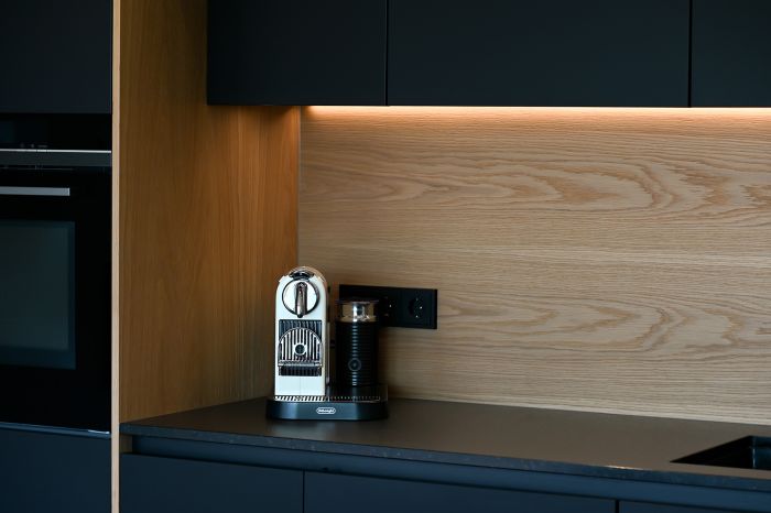 Licht aus, Spot an! Was individuelle Lichtkonzepte bewirken können, das zeigt sich in dieser schönen Küche in edlen Schwarz- und Holztönen.