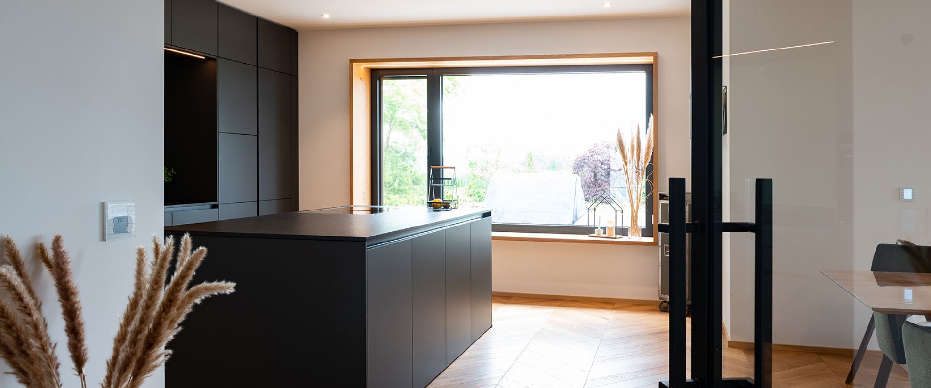 Die olivgrüne Rückwand kontrastiert hervorragend mit der Arbeitsplatte aus luxuriösem, tiefschwarzem Nero-Assoluto-Naturstein und den hochwertigen UV-Lackfronten in mattem Lavaschwarz. Der warme Holzboden in Fischgrätmuster passt perfekt dazu – und bietet der offenen Wohnküche den optimalen Rahmen.