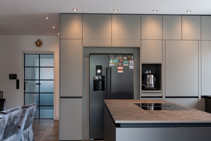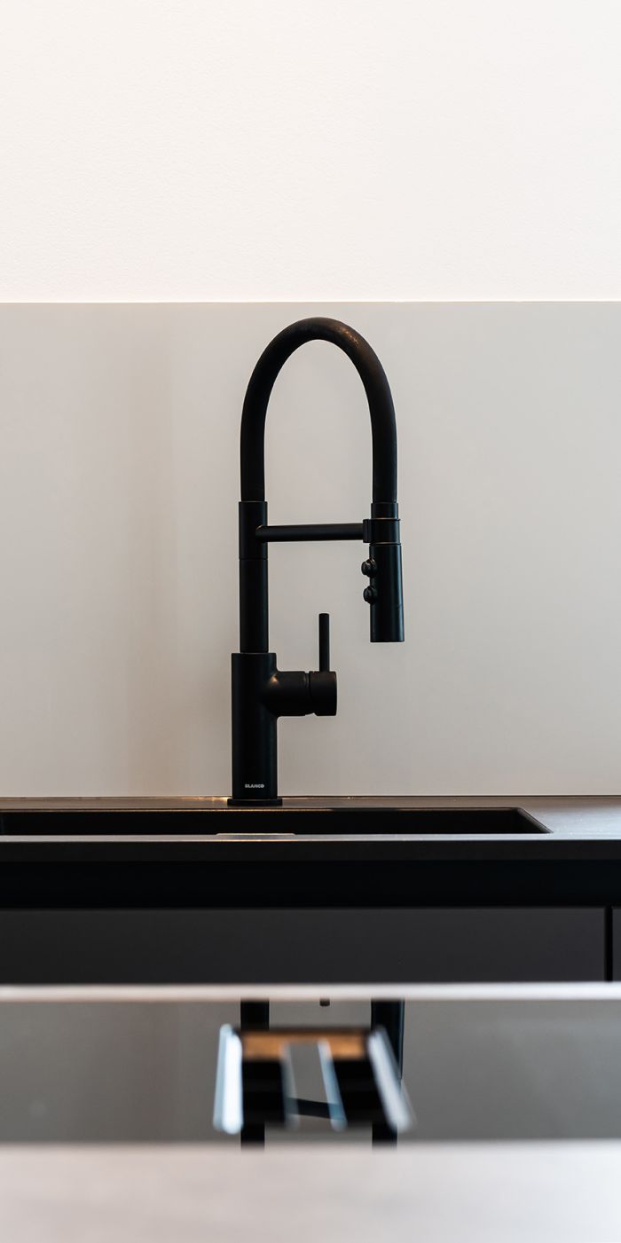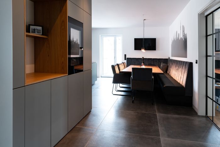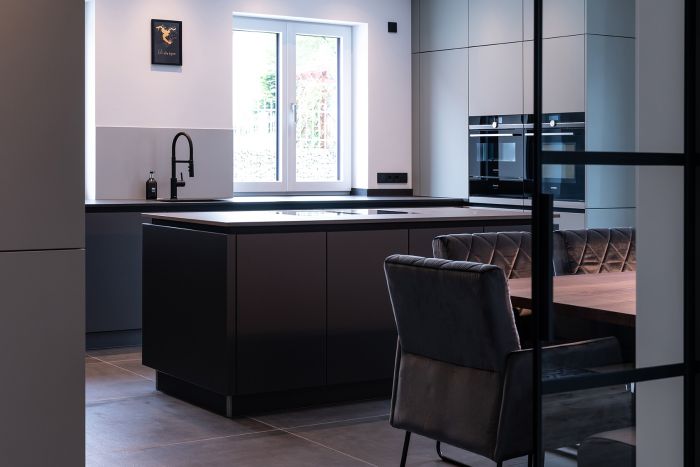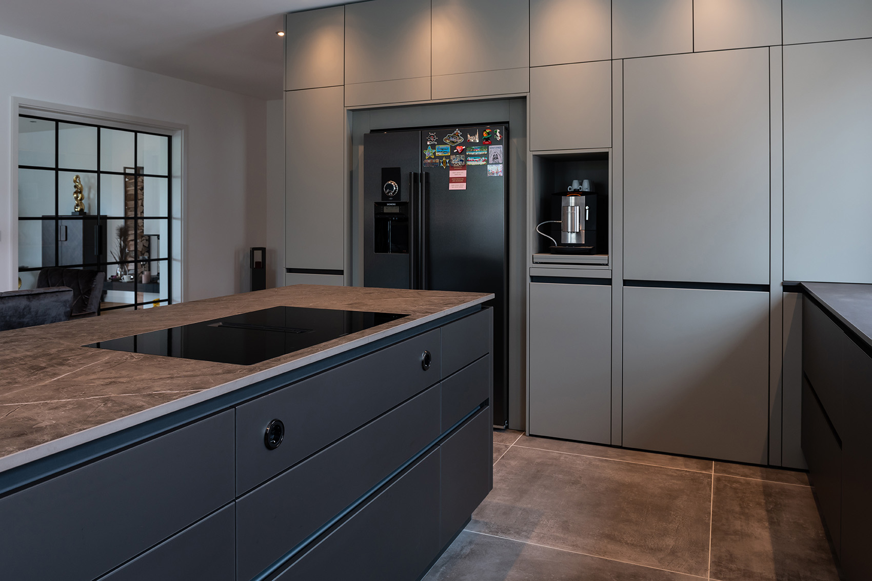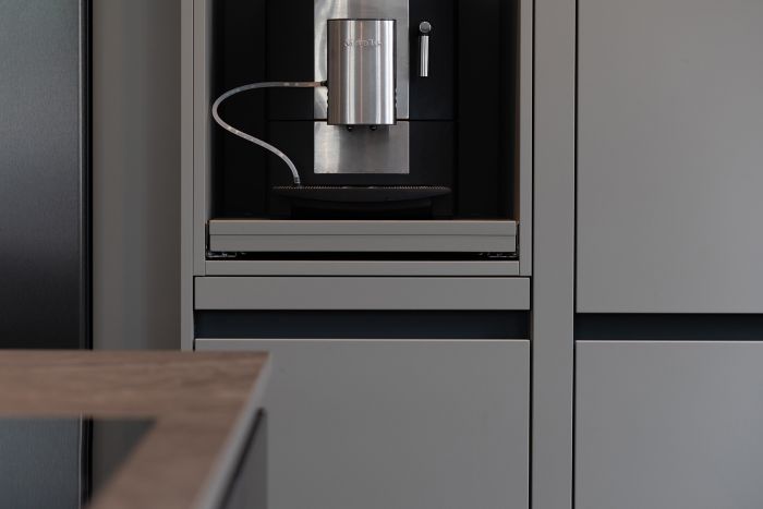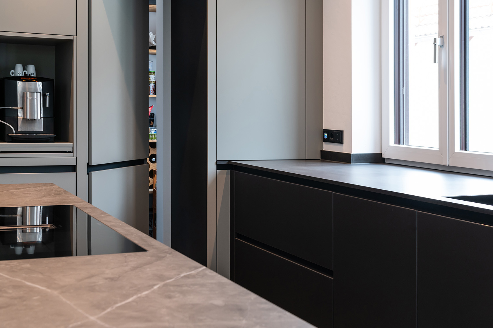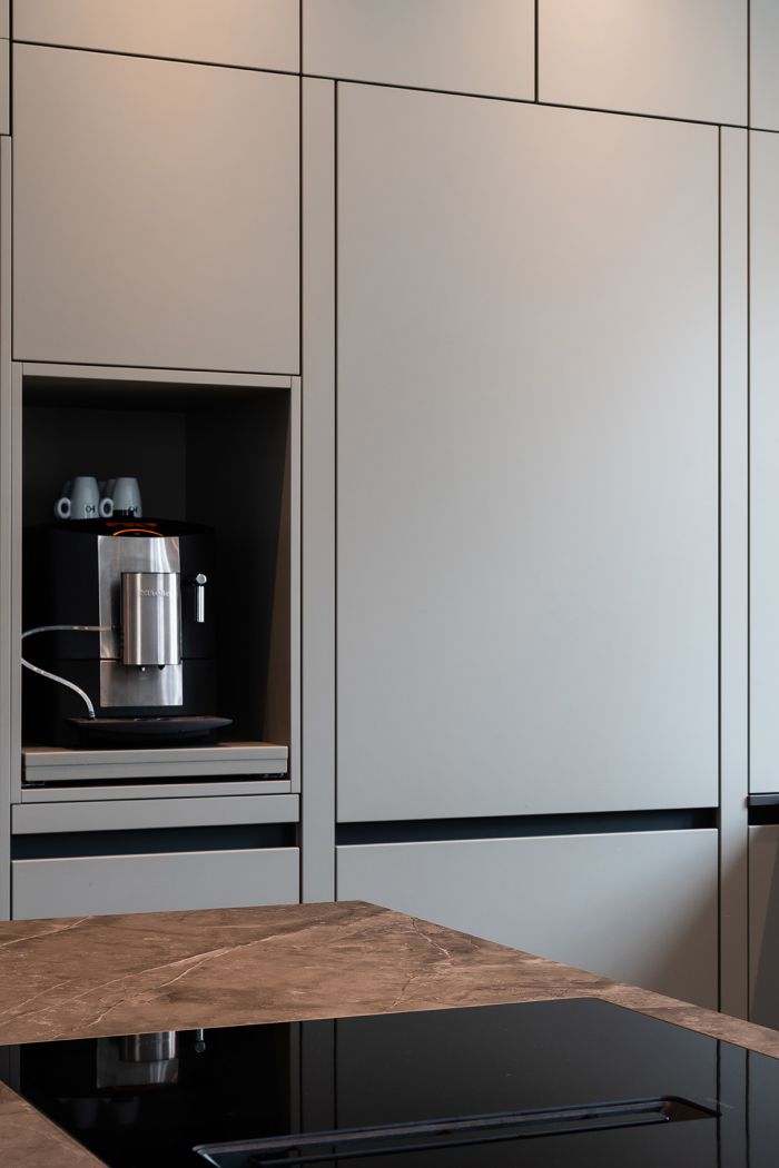Mit der fleckresistenten Dekton-Arbeitsplatte macht das Kochen erst so richtig Freude. Schließlich ist Dekton absolut unempfindlich gegenüber hohen Temperaturen und absolut kratzfest. Ergonomische Lösungen wie der Auszug für den Kaffeevollautomaten und die in den Hochschränken versteckte Speiseschranktür runden die großzügige Küchenplanung ab. Kontrastreiches Detail am Rande: Die schwarzen Griffmulden greifen die Farbgebung der Elektrogeräte sowie der Lofttüren auf.