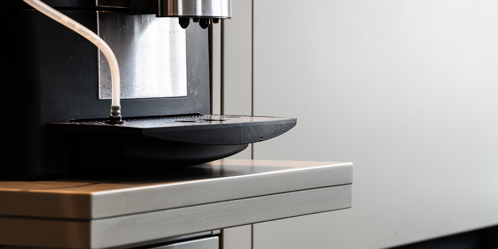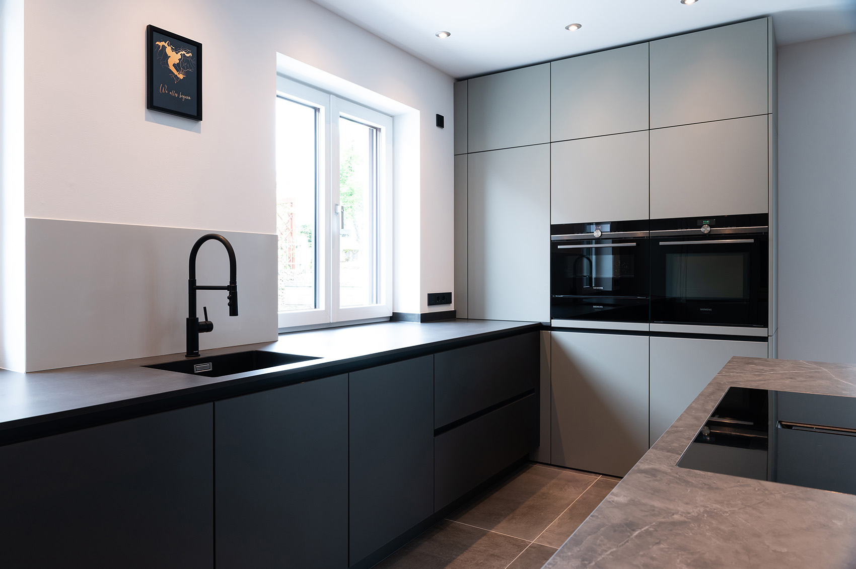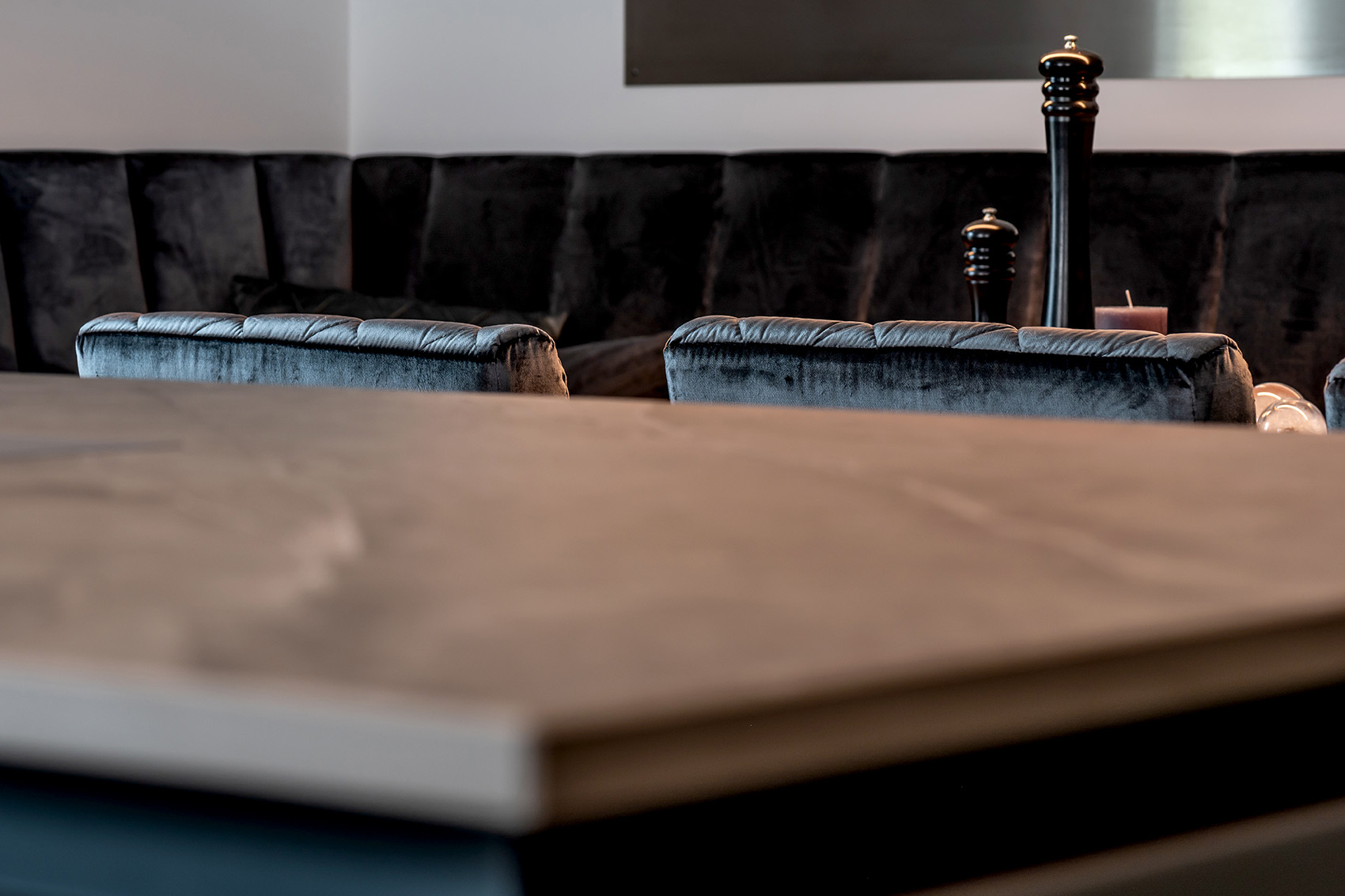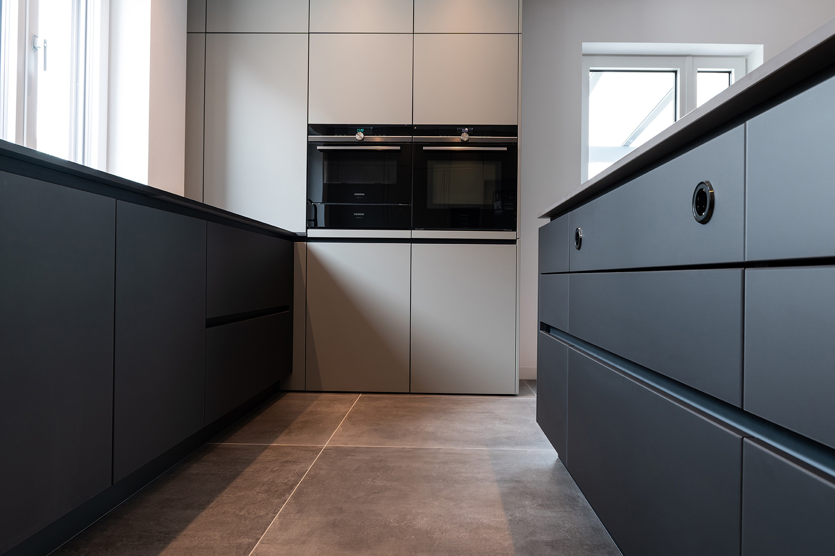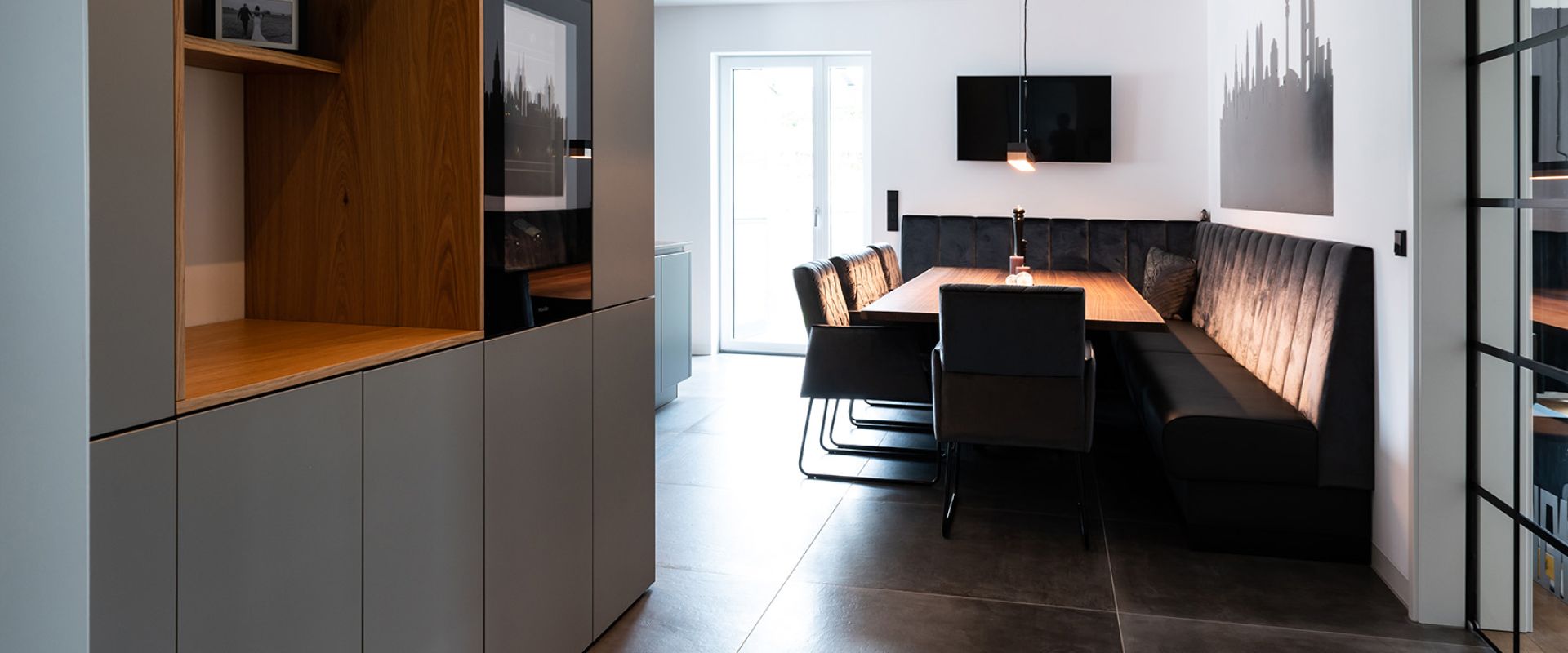 Mit der fleckresistenten Dekton-Arbeitsplatte macht das Kochen erst so richtig Freude. Schließlich ist Dekton absolut unempfindlich gegenüber hohen Temperaturen und absolut kratzfest. Ergonomische Lösungen wie der Auszug für den Kaffeevollautomaten und die in den Hochschränken versteckte Speiseschranktür runden die großzügige Küchenplanung ab. Kontrastreiches Detail am Rande: Die schwarzen Griffmulden greifen die Farbgebung der Elektrogeräte sowie der Lofttüren auf.