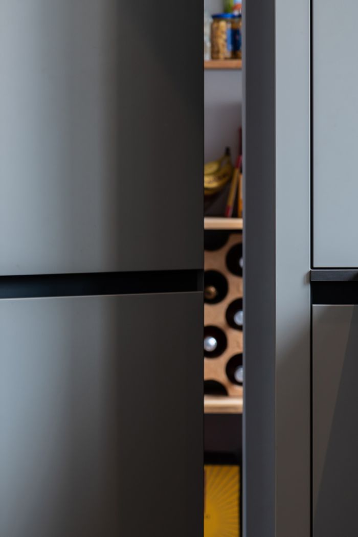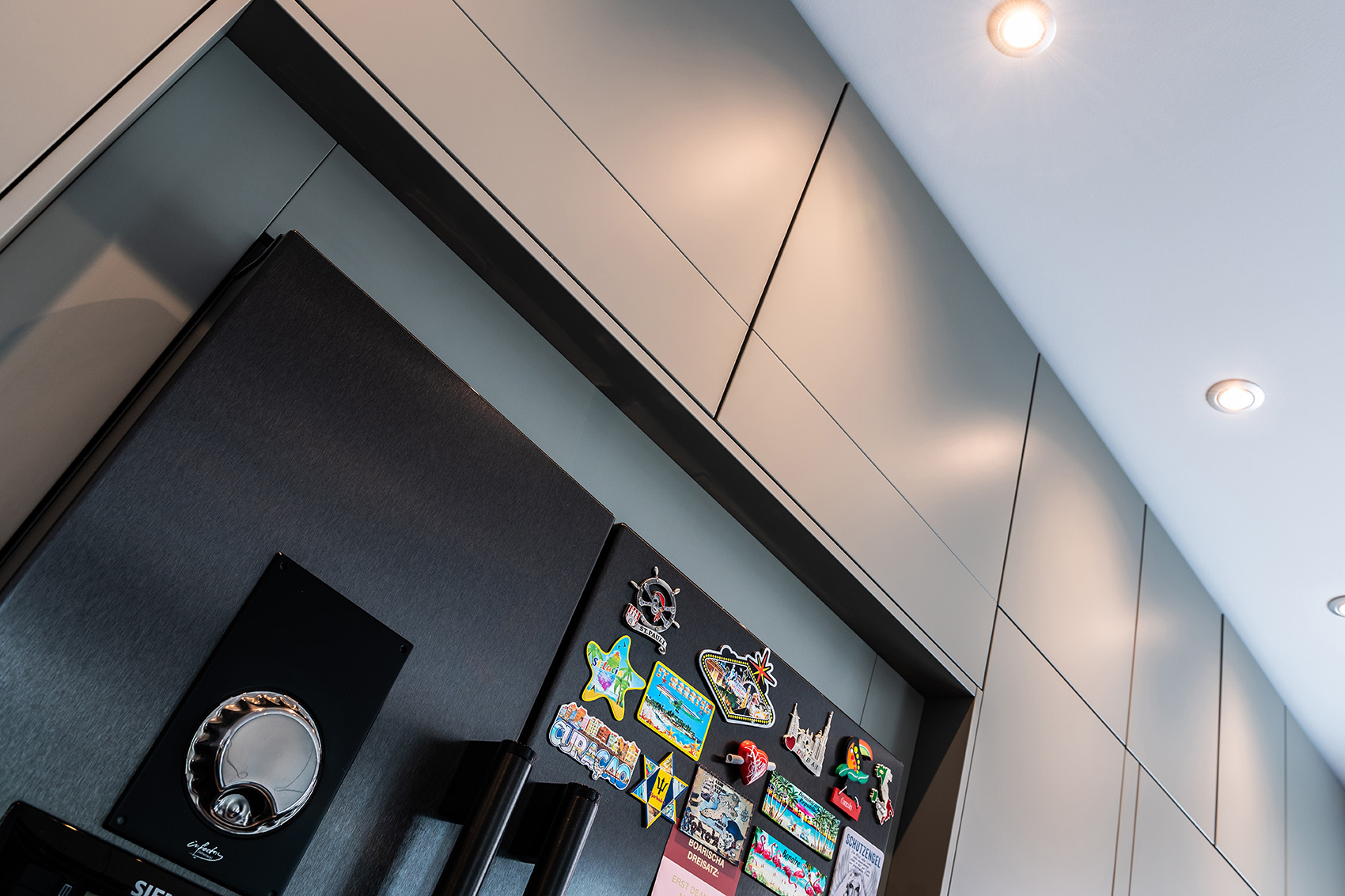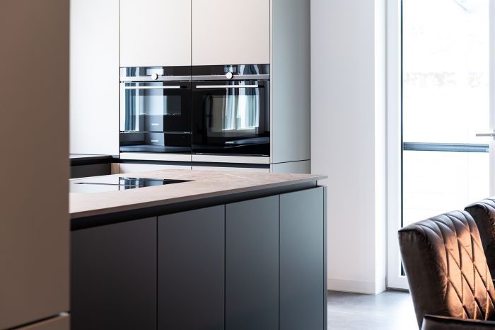 Clevere Stauraumlösungen in seiner schönsten Form. Diese moderne Küche mit samtig-matten Lack-Fronten schafft den Spagat zwischen reichlich Platz und einem einladenden Design spielend.